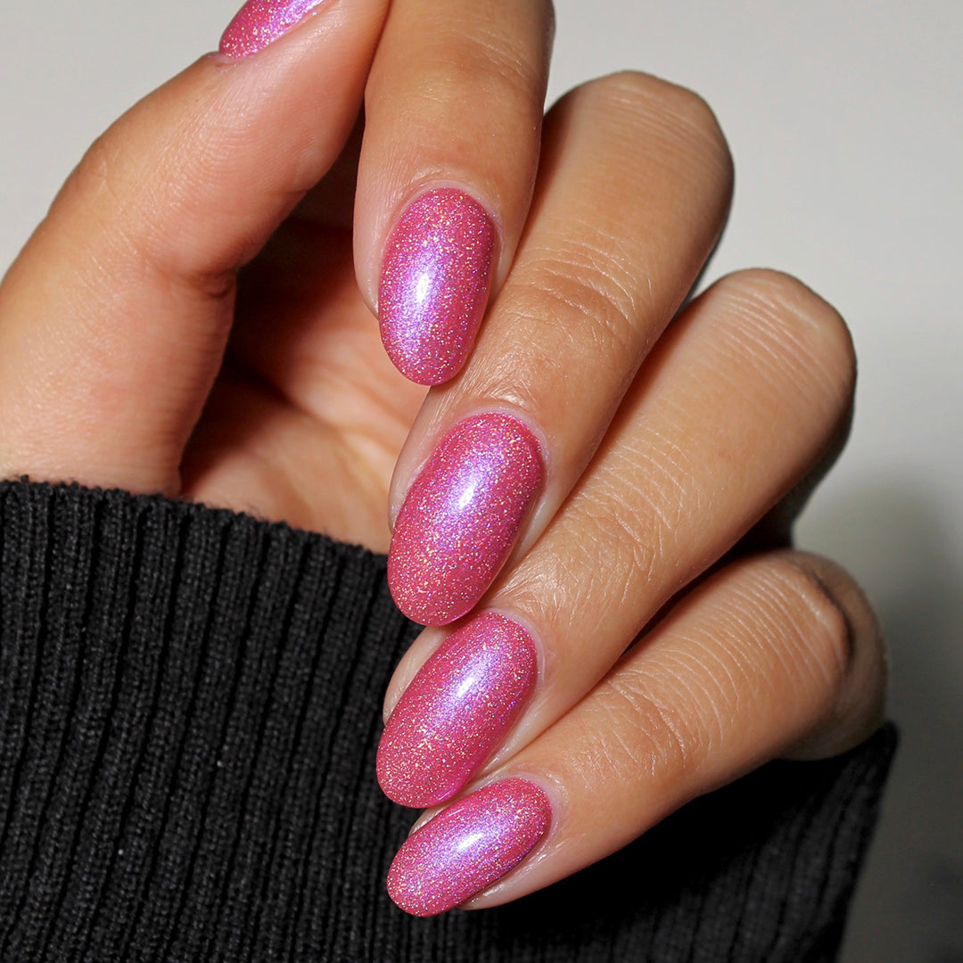 - Crushed holographic formula in a bubblegum pink shade with indigo-blue iridescent micro-shimmer underglow