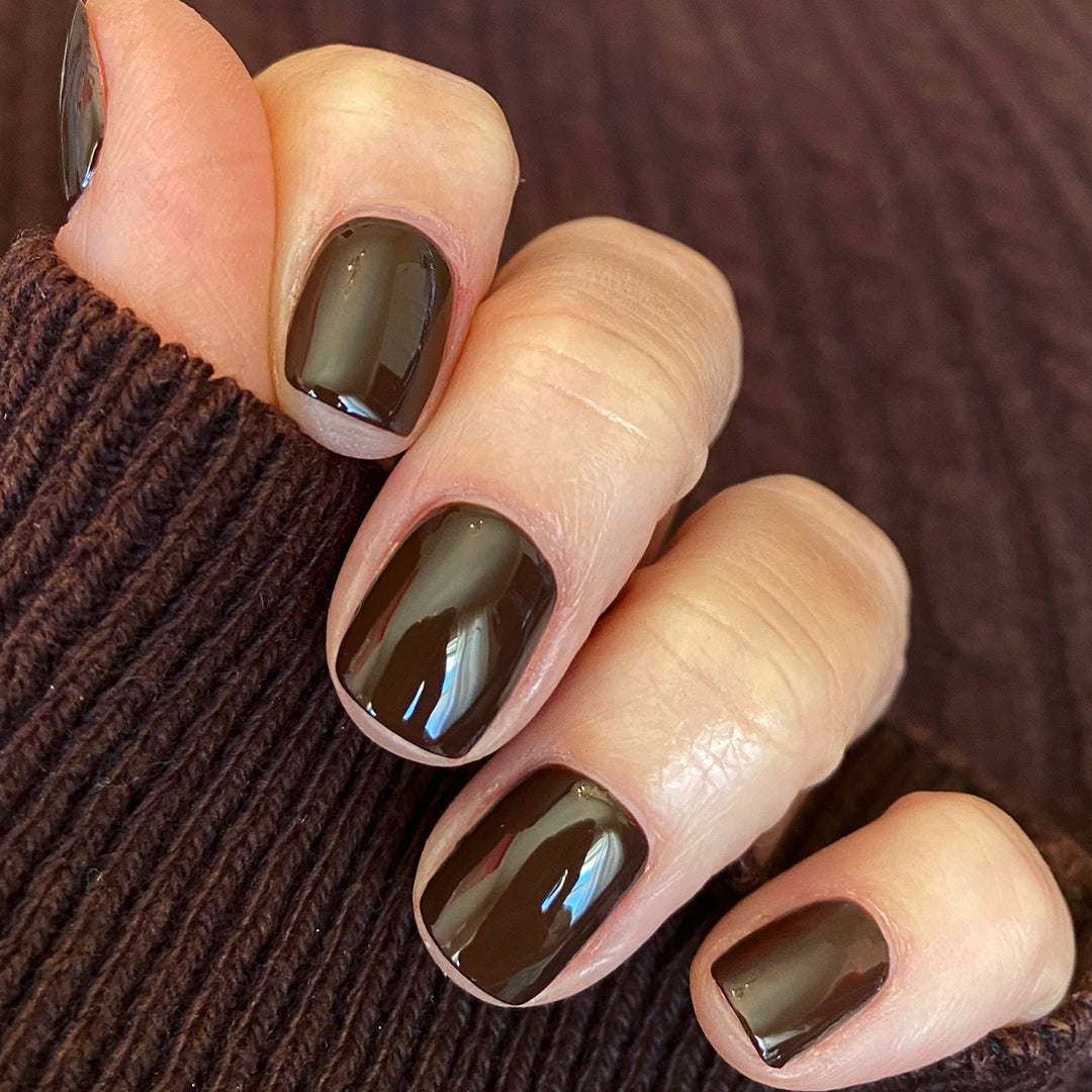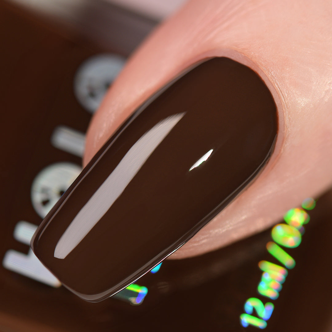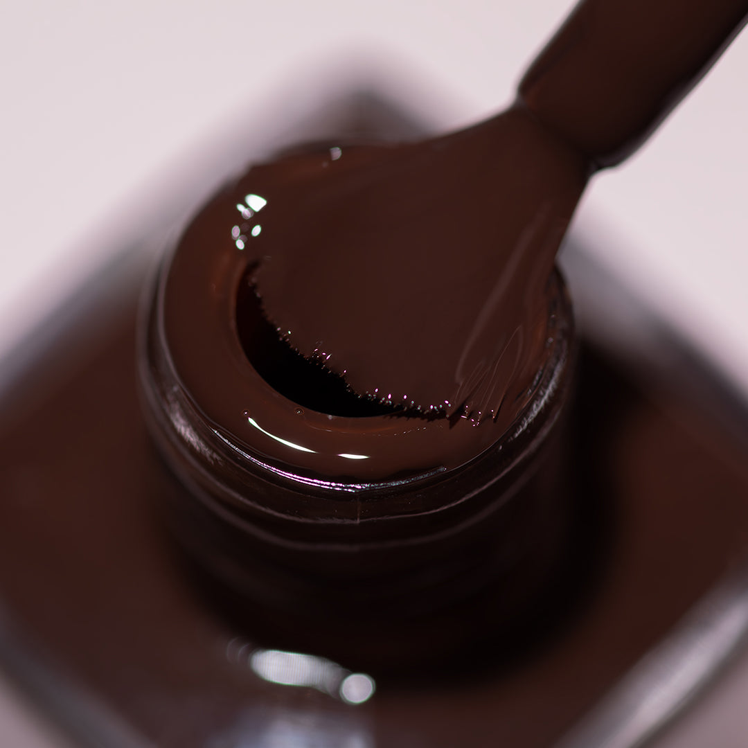 - Dark chocolate-brown polish with a crème formula