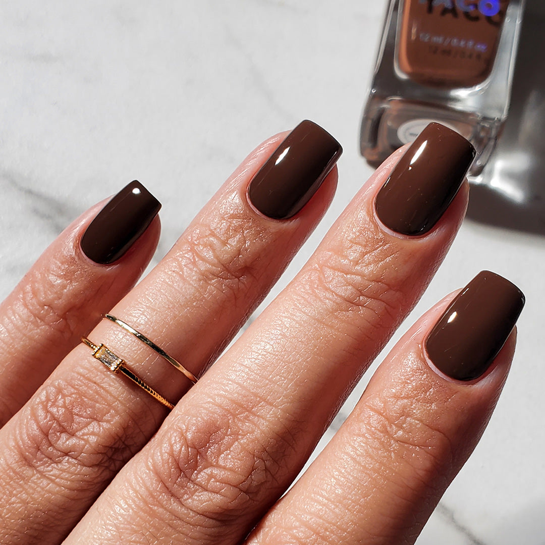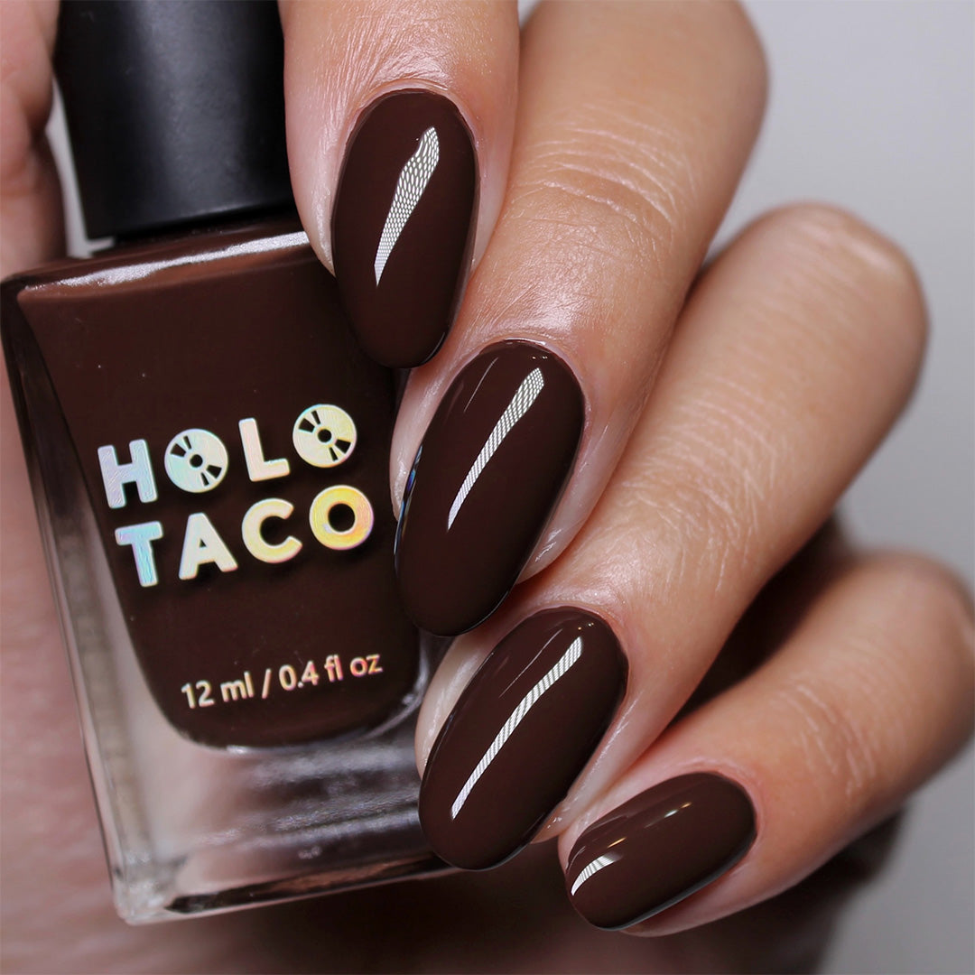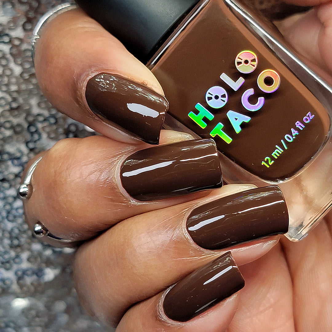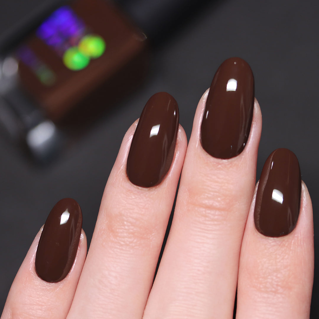 - Dark chocolate-brown polish with a crème formula