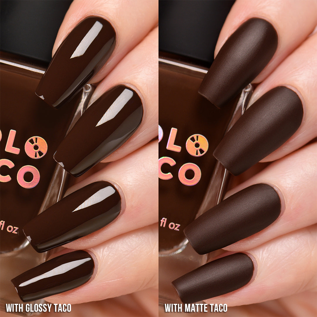 - Note: Super-pigmented shades may cause staining depending on the porousness of the nail and the use of a protective base coat. Swatch photos as pictured have one coat of Glossy Taco for optimal smoothness and shine.