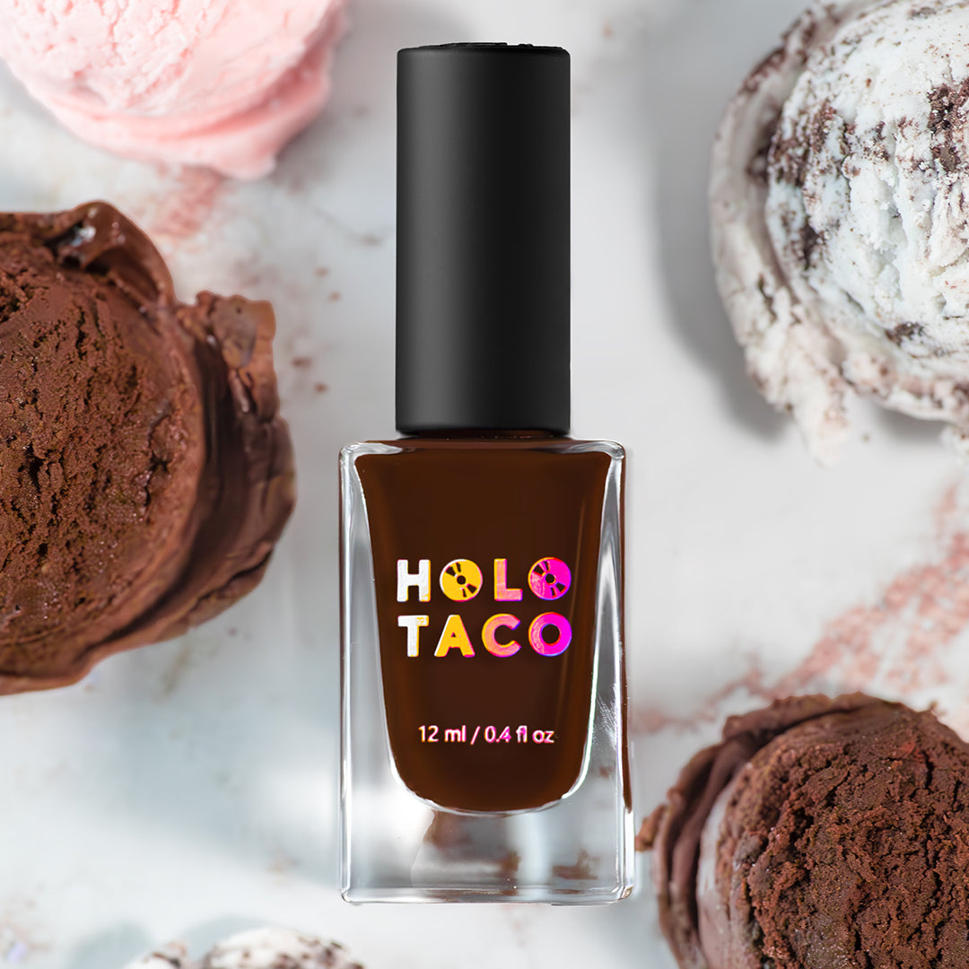Rich chocolate brown, an absolute stunner. Paired with Butter Me Up and Lowkey Blushing for a cute Neopolitan ice-cream vibe