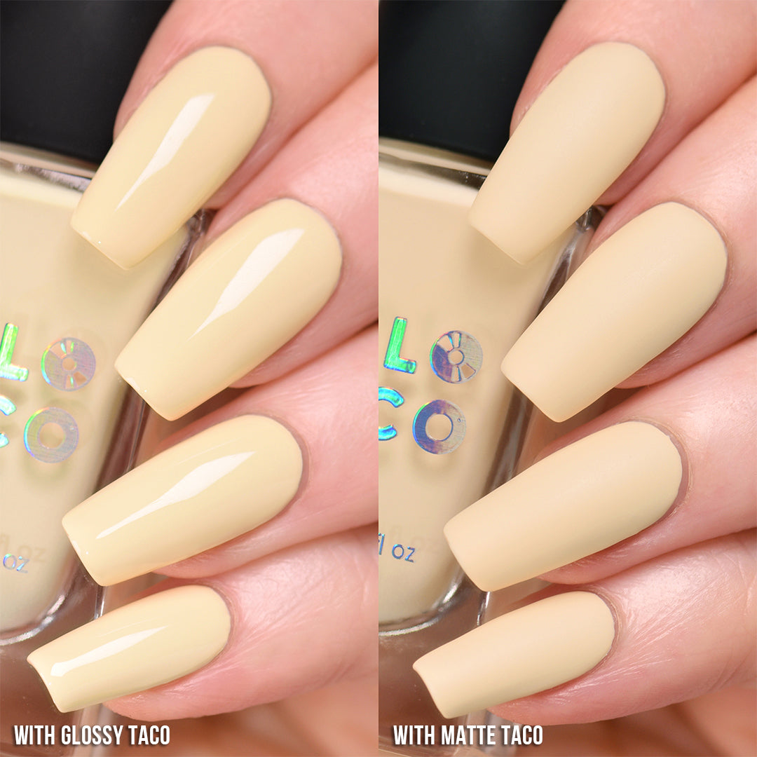 - Note: Super-pigmented shades may cause staining depending on the porousness of the nail and the use of a protective base coat. Swatch photos as pictured have one coat of Glossy Taco for optimal smoothness and shine.