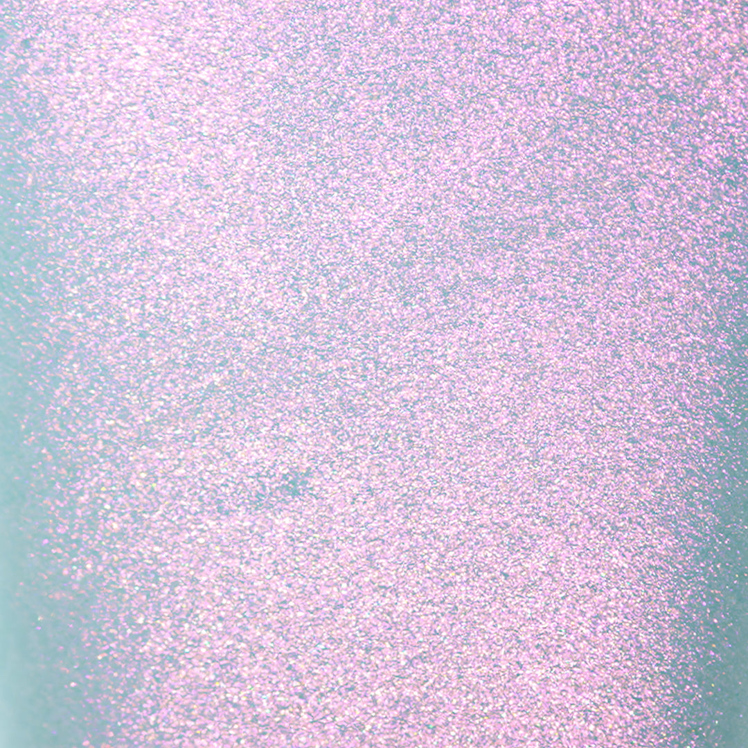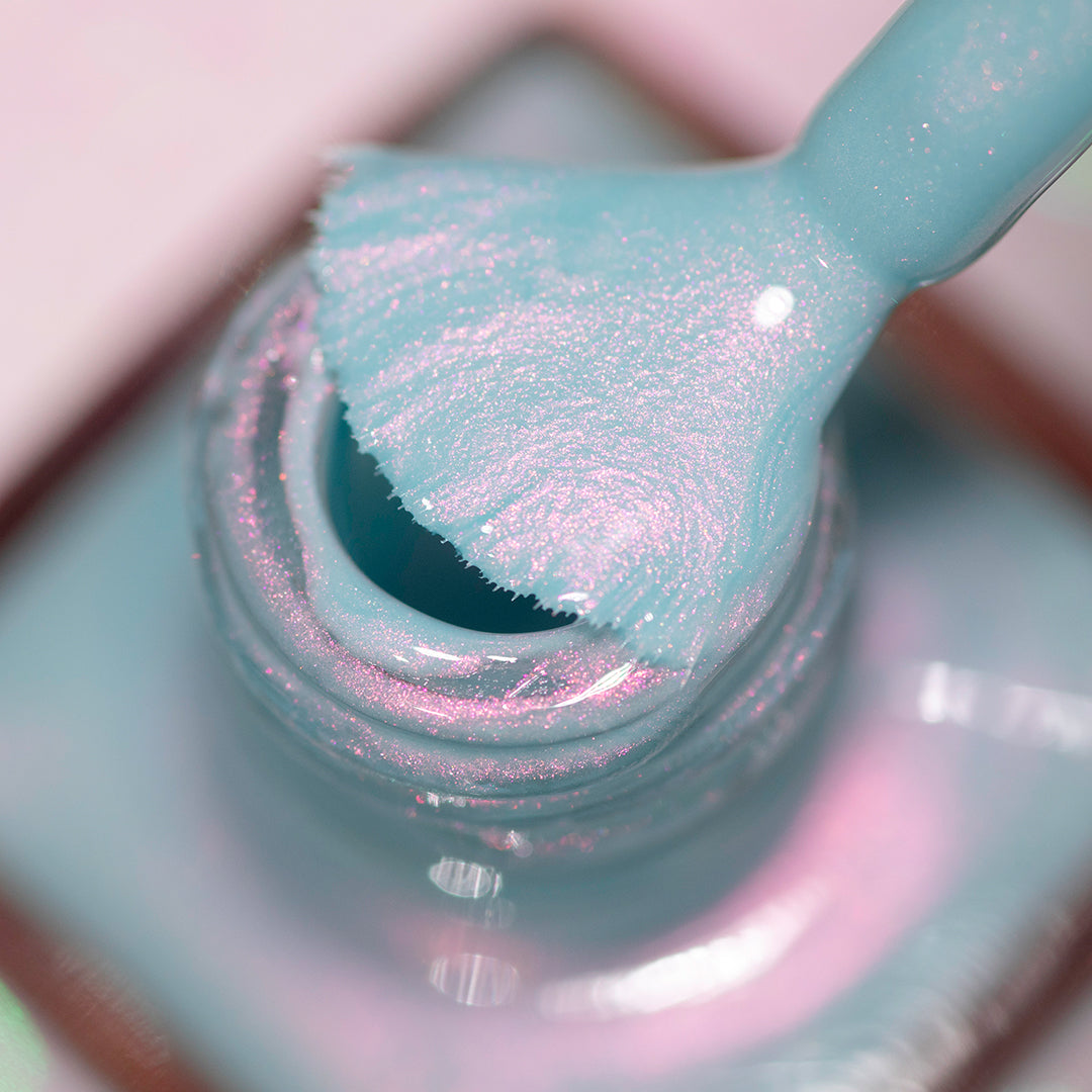- Light aqua-green jelly base with iridescent pink micro-shimmer