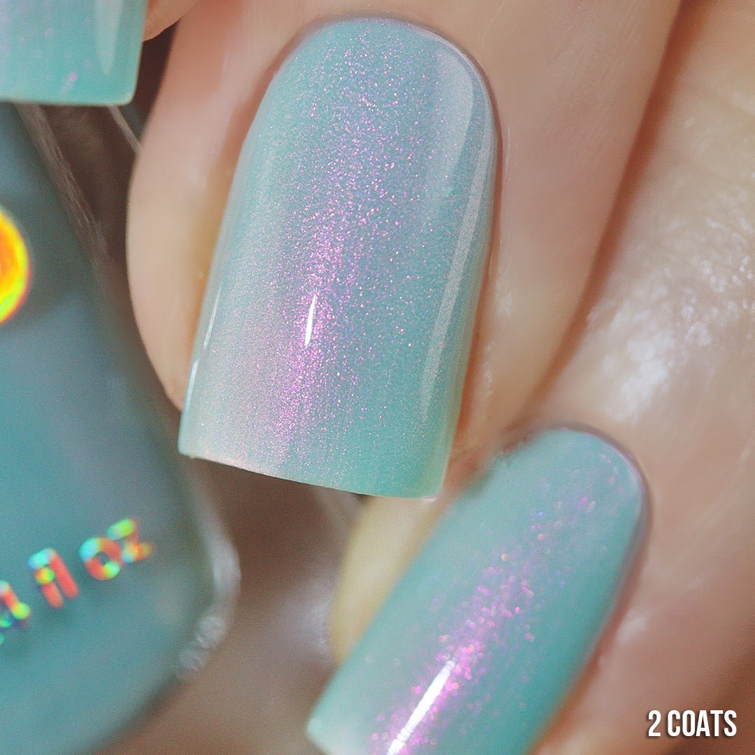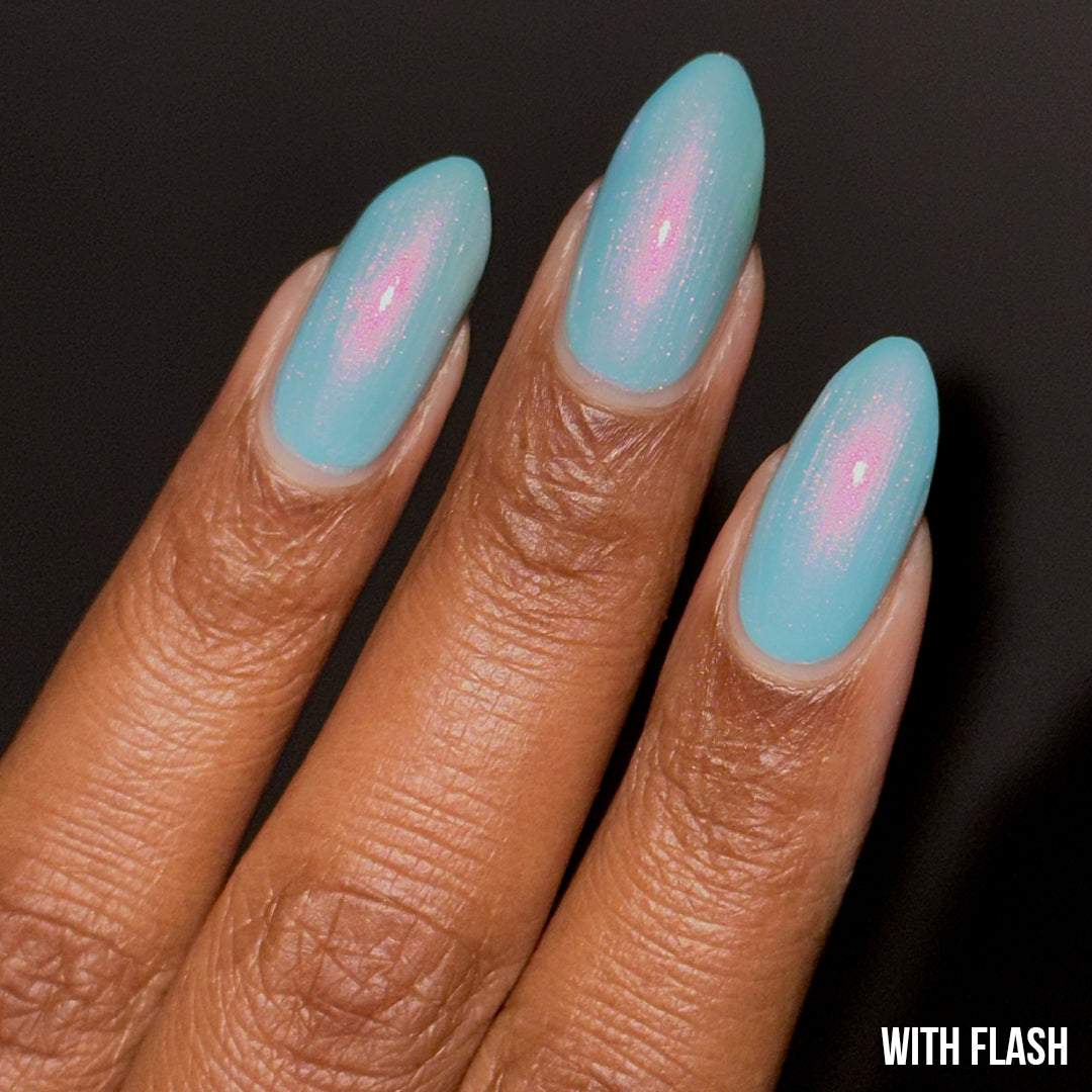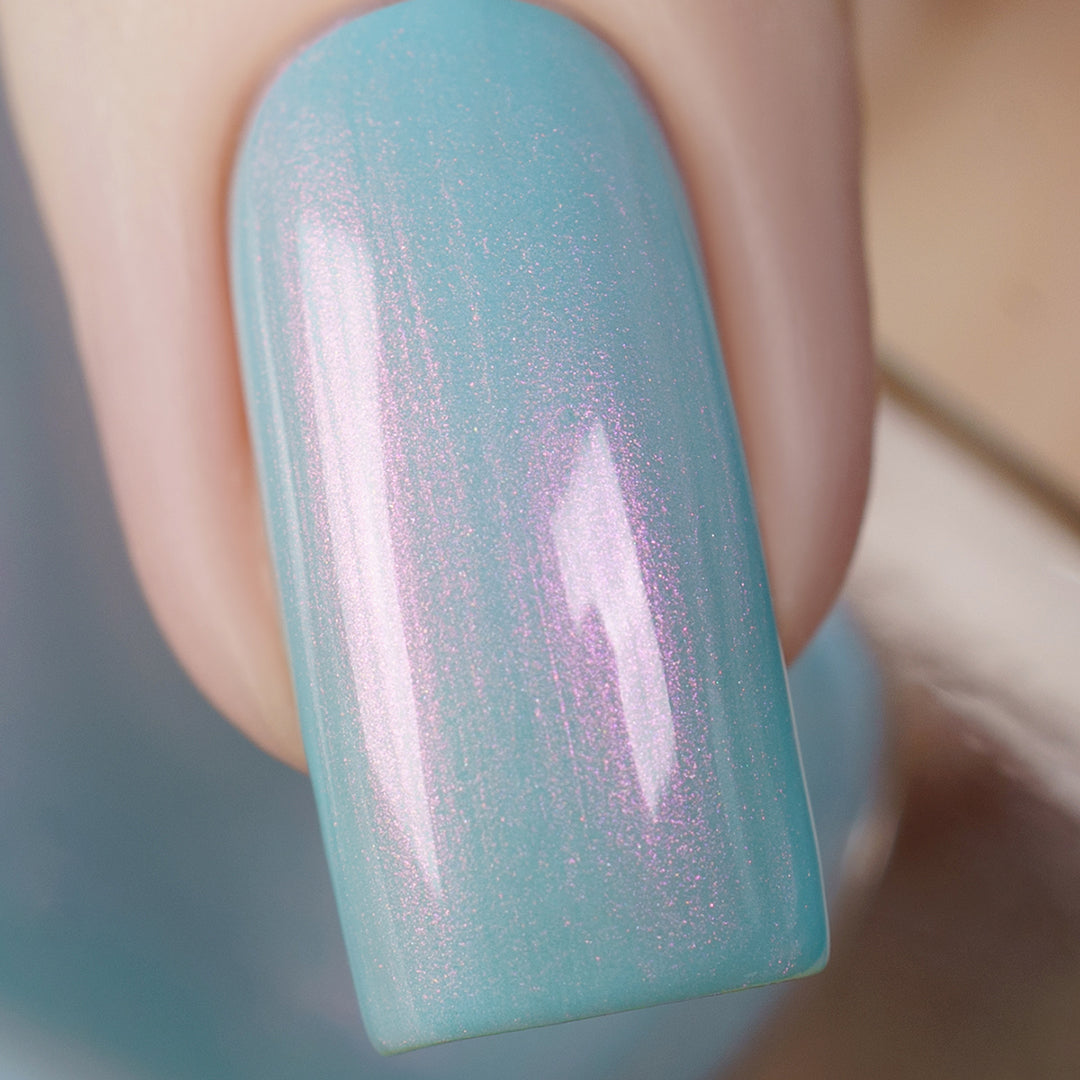 Wade into the calming waters of Moon Lagoon. This glacial pool aqua-green shade is lit from within, with an underglow of pink iridescent micro-shimmer that builds in two to three coats. Find serenity now and decide to sink or swim later.
