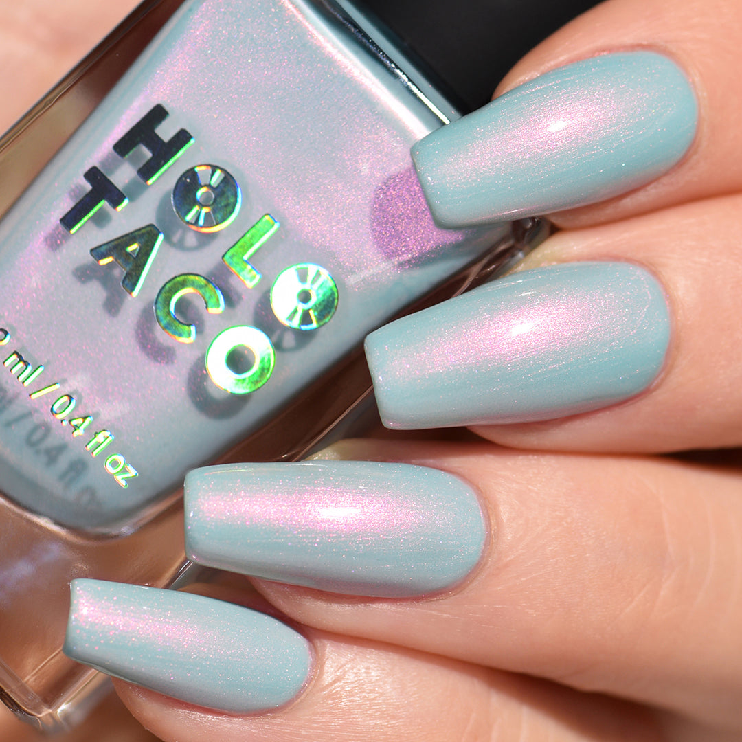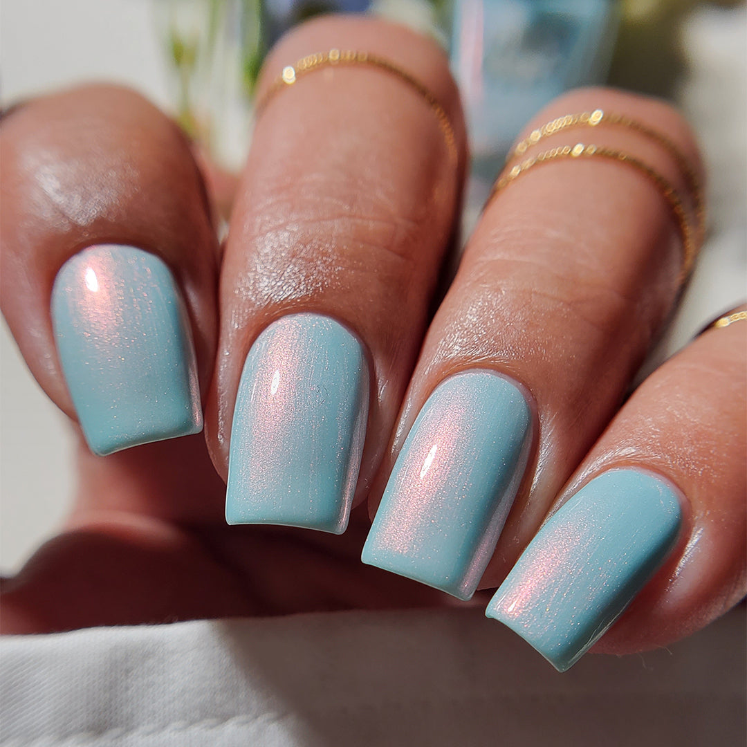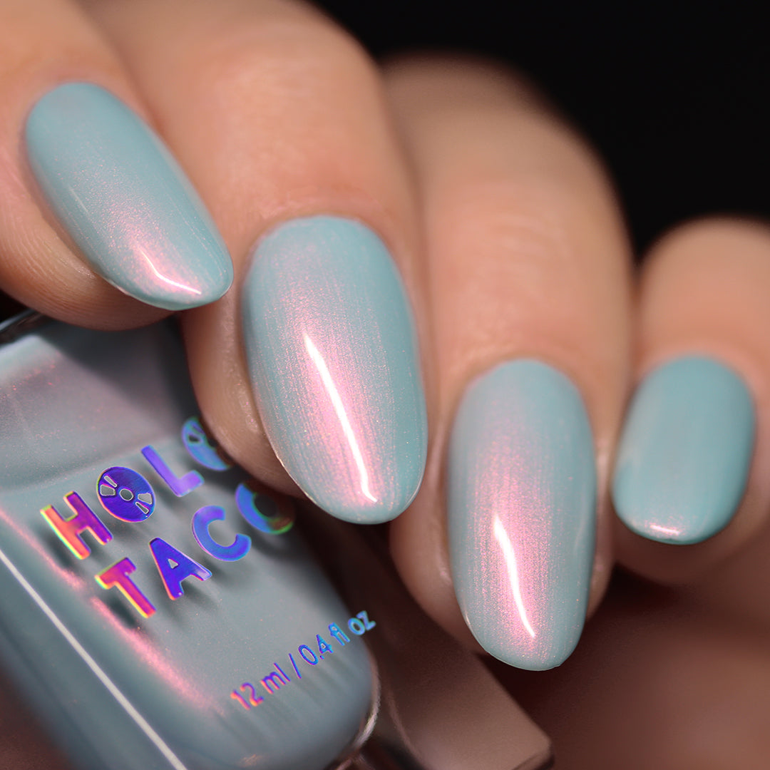 Wade into the calming waters of Moon Lagoon. This glacial pool aqua-green shade is lit from within, with an underglow of pink iridescent micro-shimmer that builds in two to three coats. Find serenity now and decide to sink or swim later.