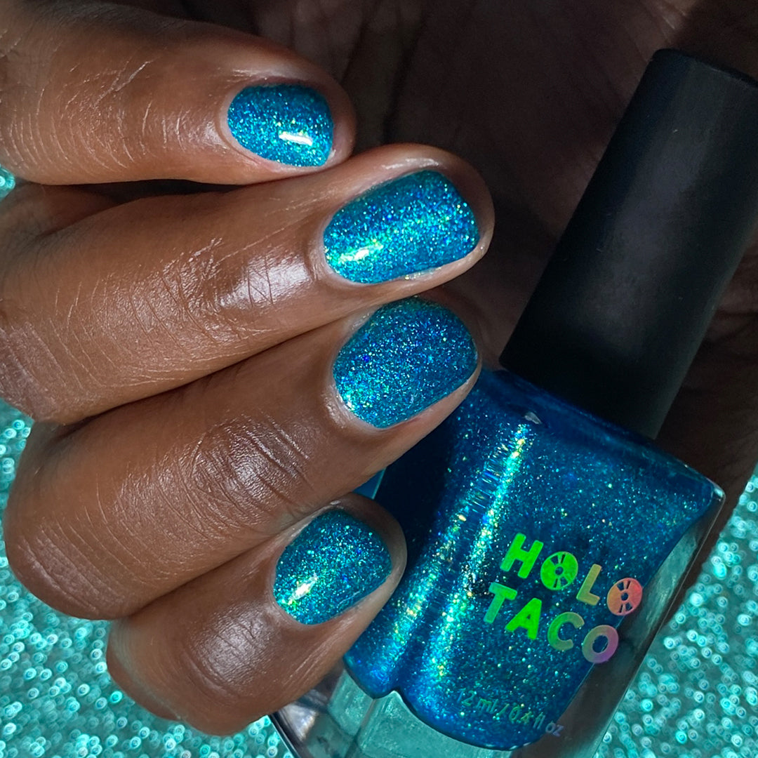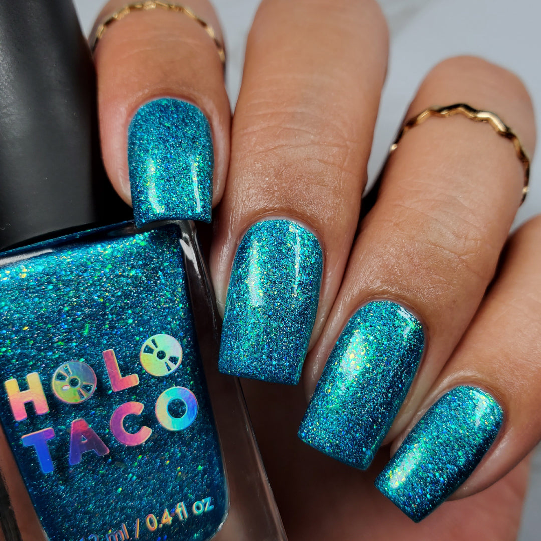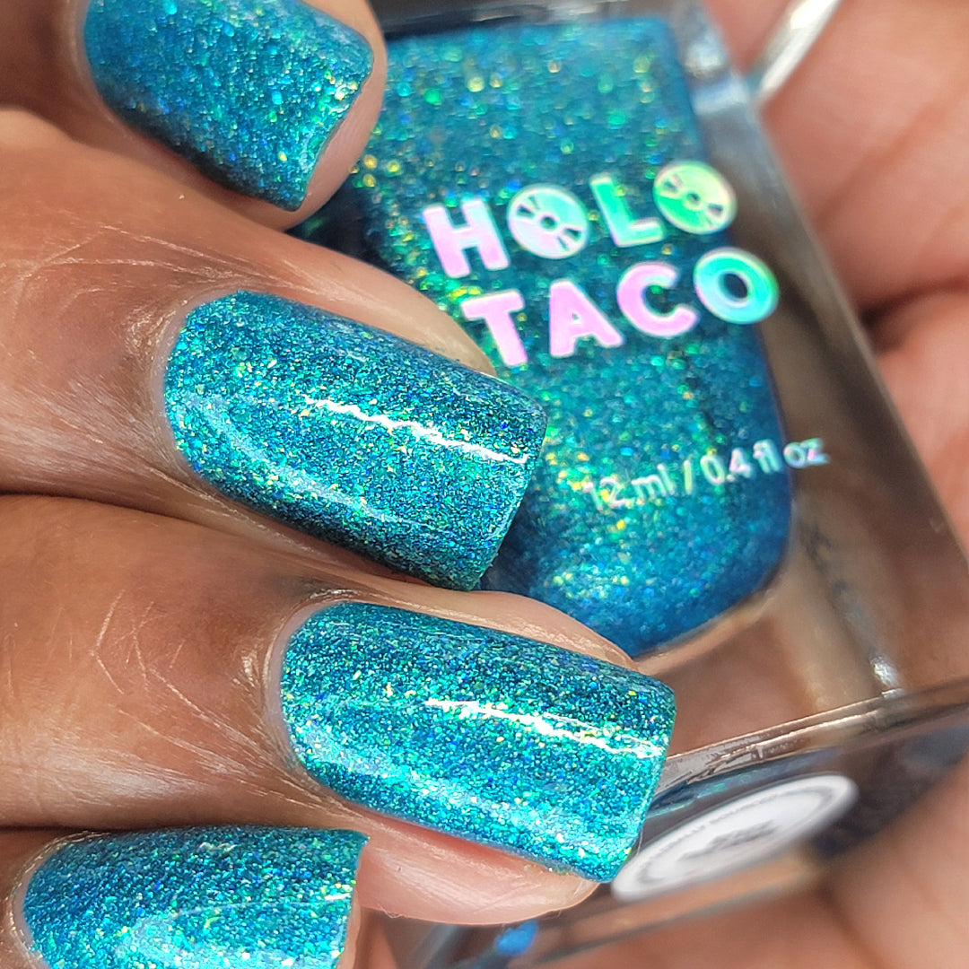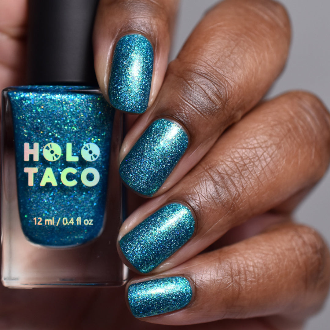 Note: Holographic nail polish shows best under direct sunlight, halogen bulbs, or just your phone camera flash! Swatch photos as pictured have one coat of Glossy Taco.