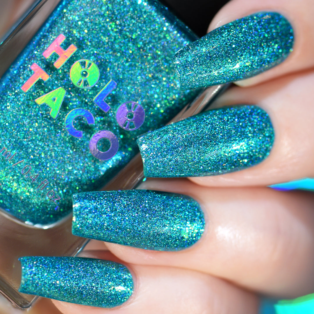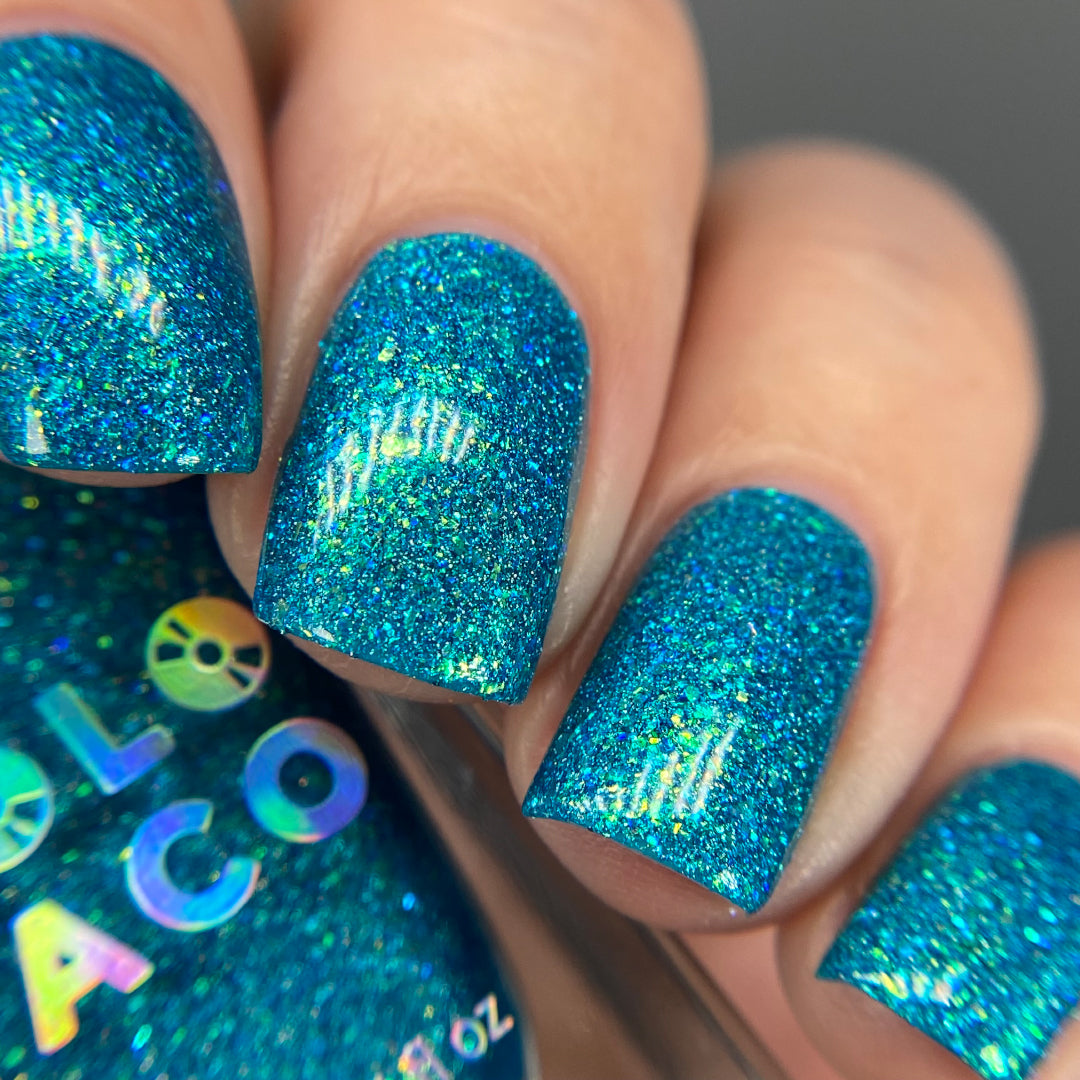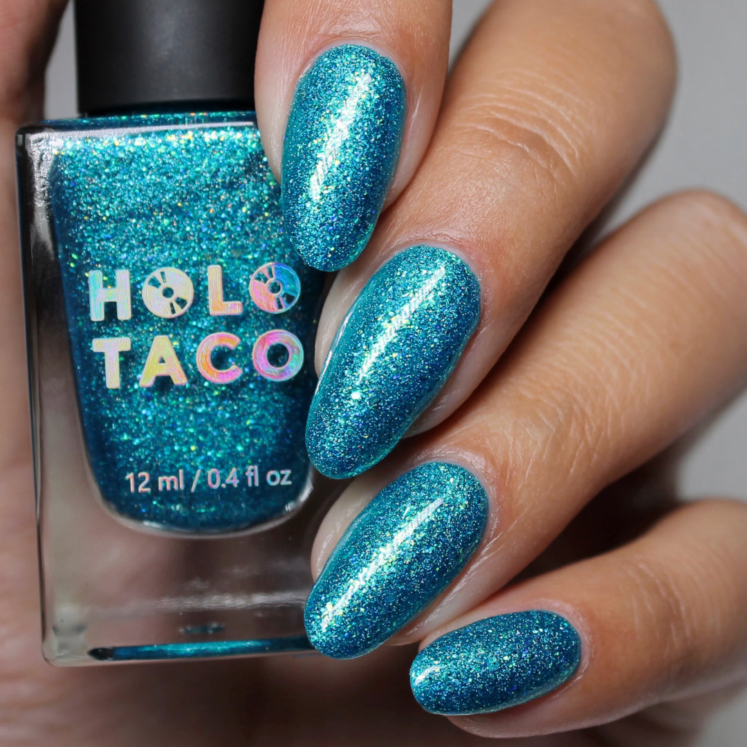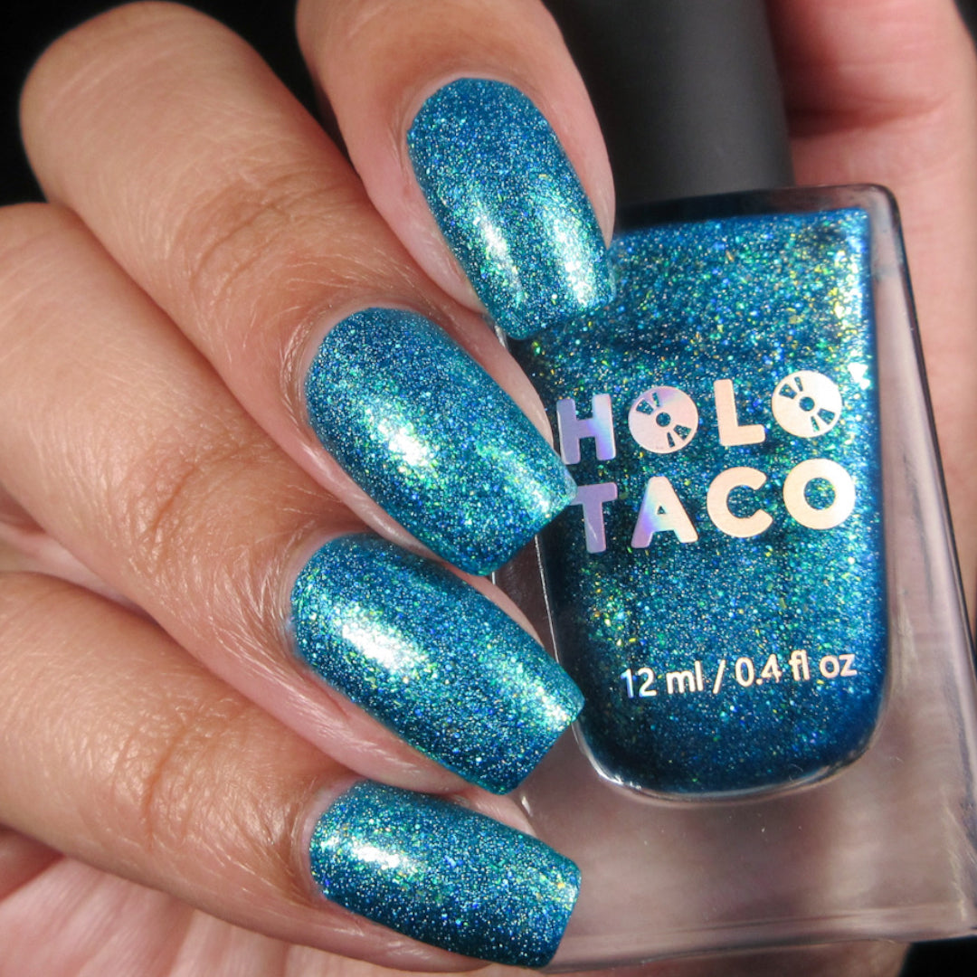 Note: Holographic nail polish shows best under direct sunlight, halogen bulbs, or just your phone camera flash! Swatch photos as pictured have one coat of Glossy Taco.