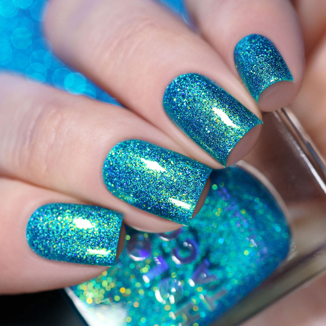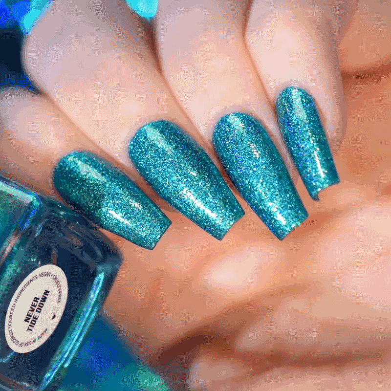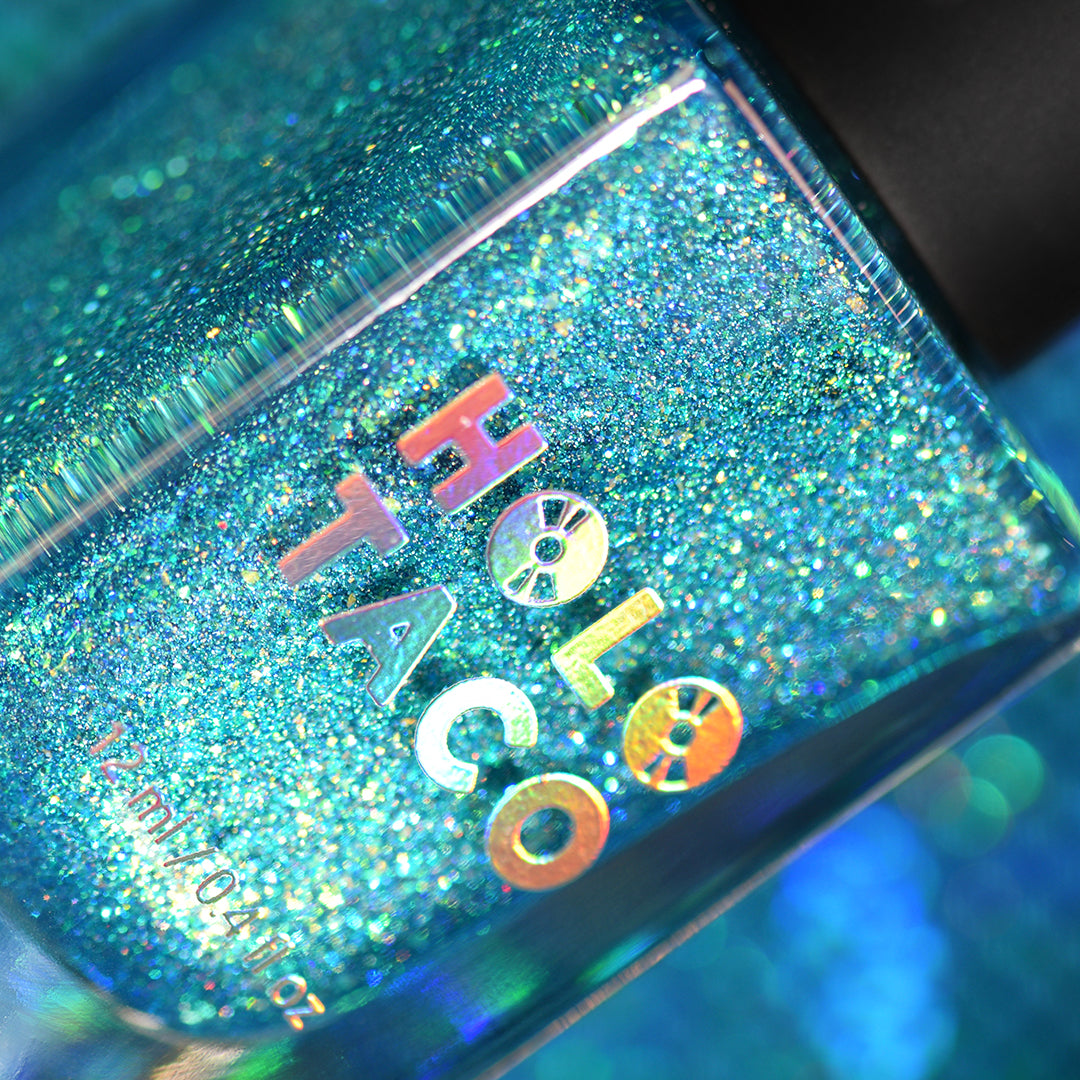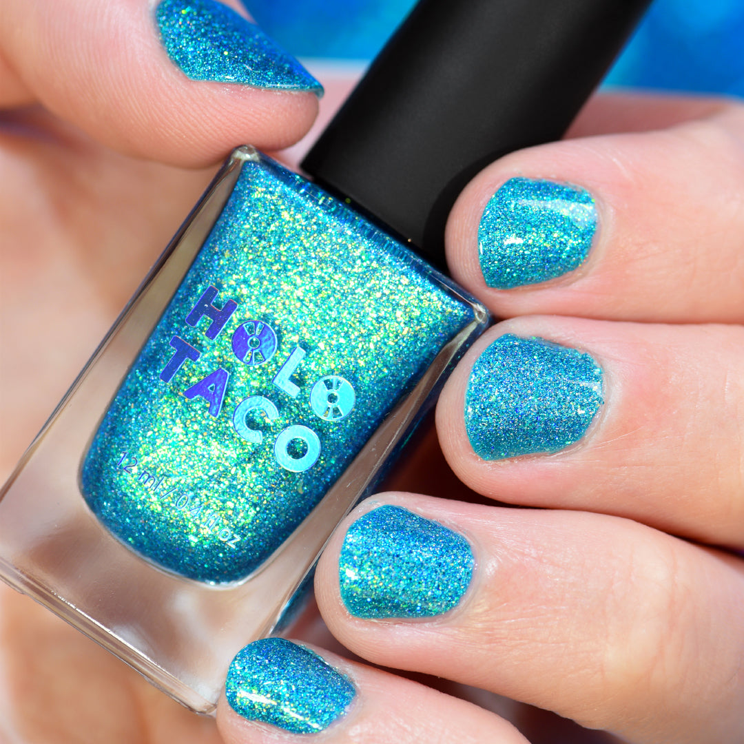 Note: Holographic nail polish shows best under direct sunlight, halogen bulbs, or just your phone camera flash! Swatch photos as pictured have one coat of Glossy Taco.