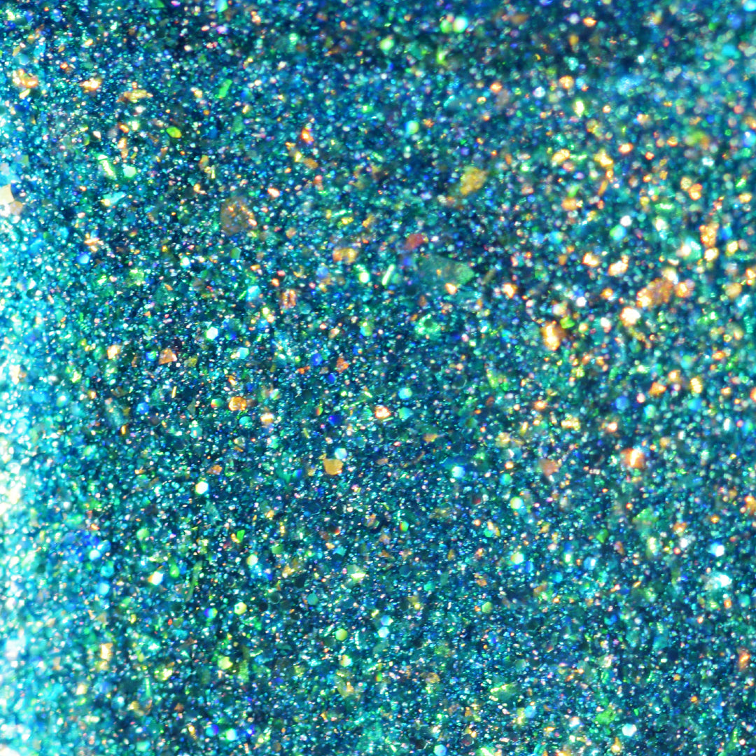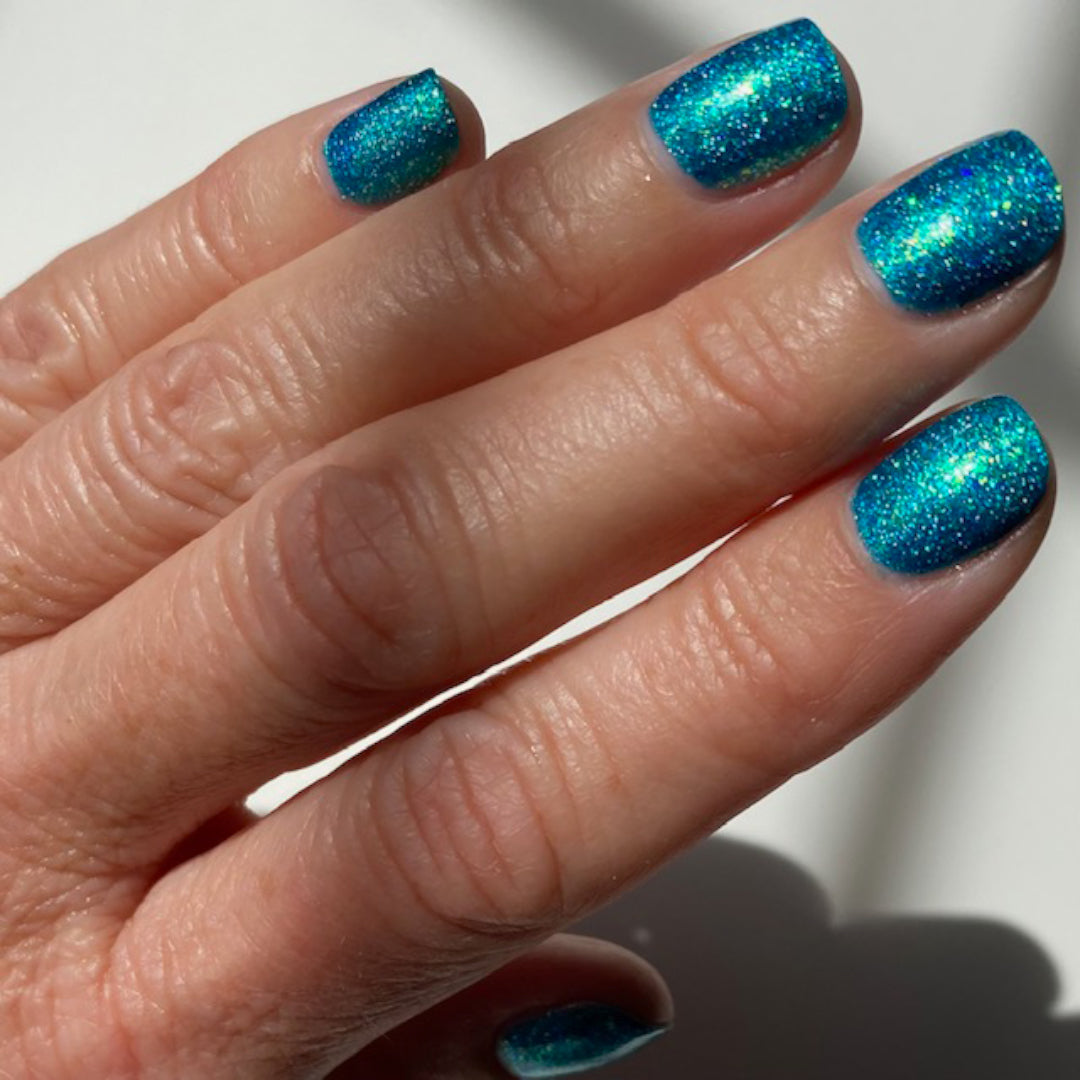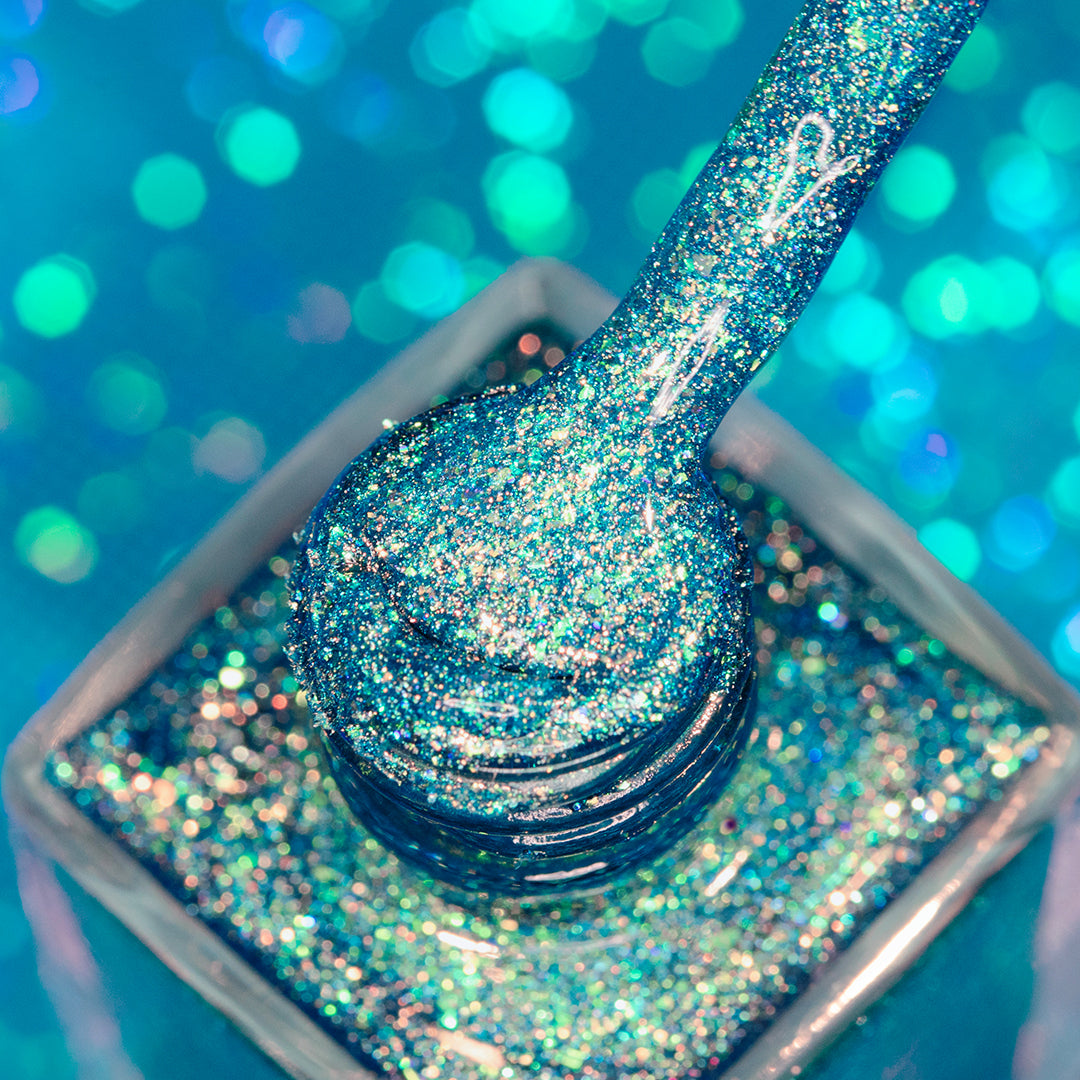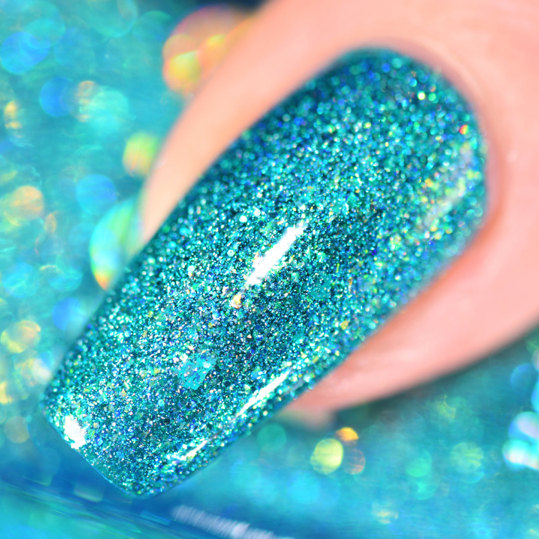 Turquoise jelly polish with iridescent flakes, holographic glitter and crushed holo