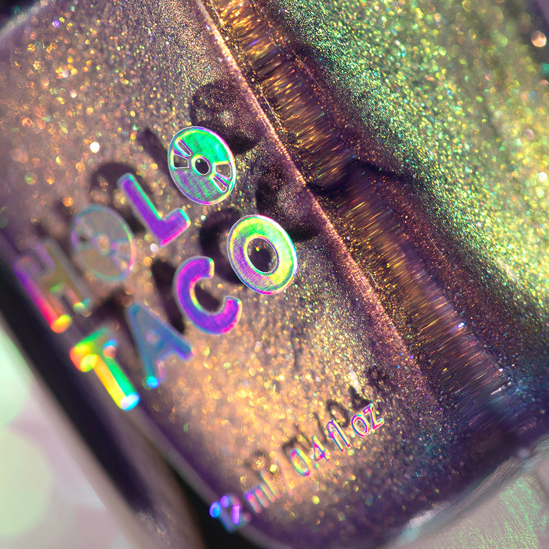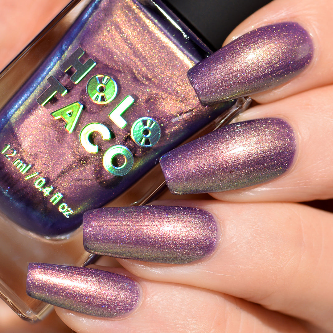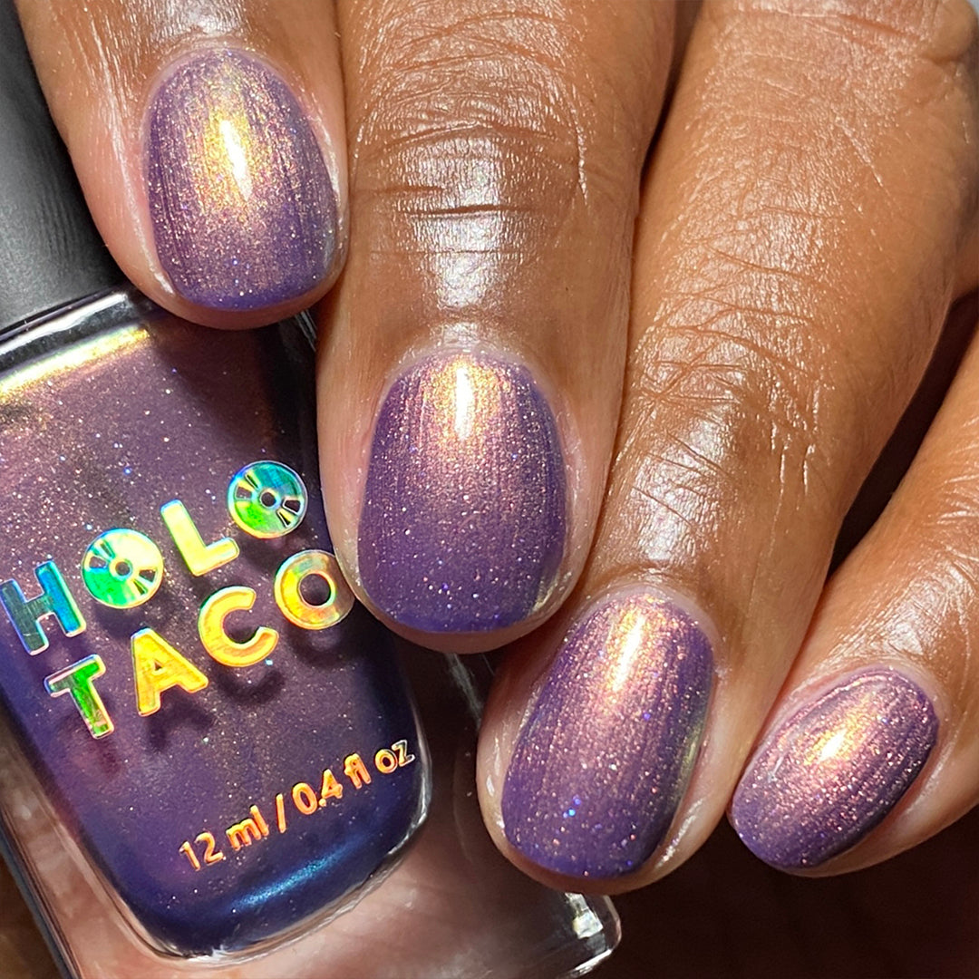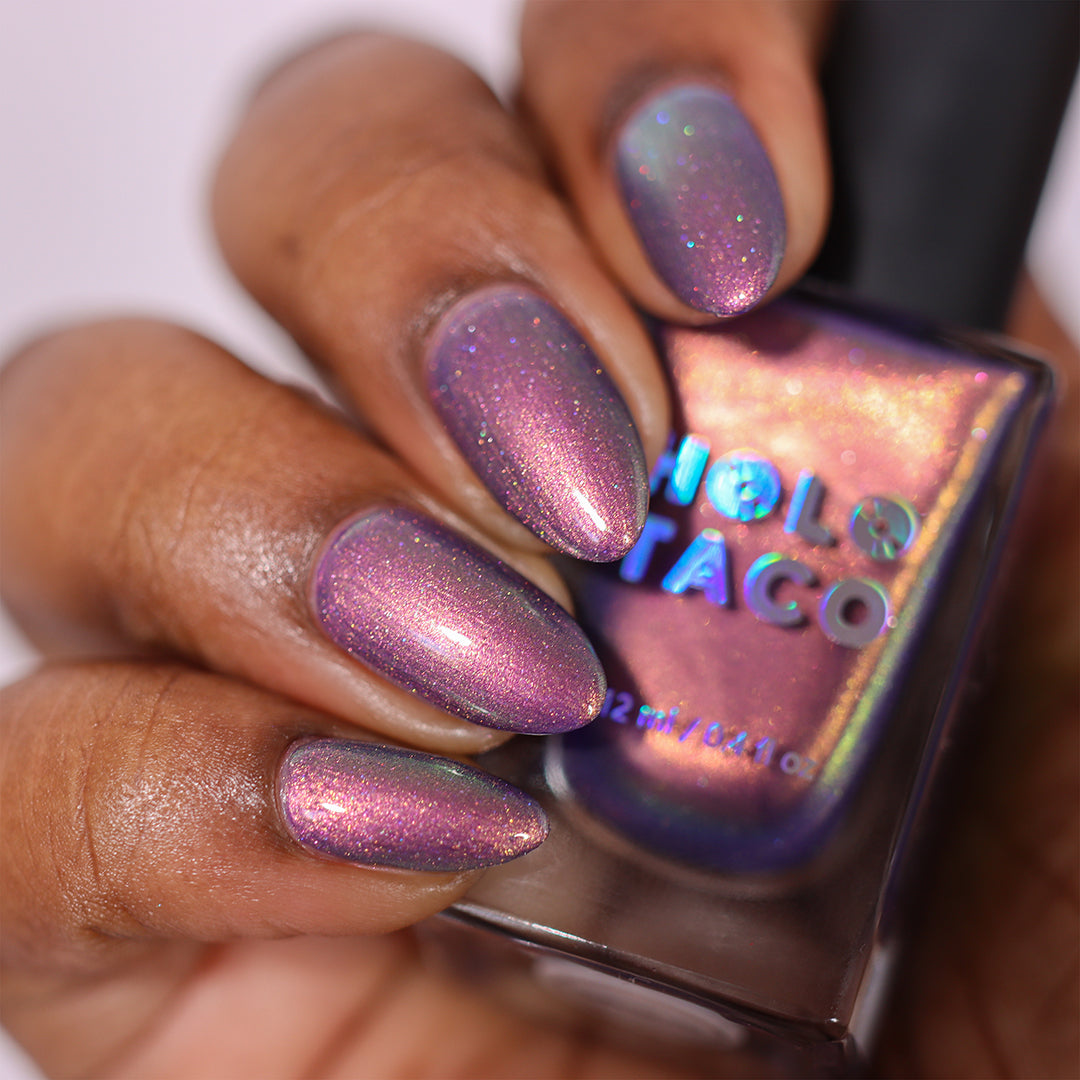 A beautiful polish in a beautiful formula with easy, thin, self-leveling coats. I feel like a lot of the photos don’t do this color justice because they can’t capture that lit from within by candlelight vibe it has. Maybe my favorite Holo Taco purple ever.