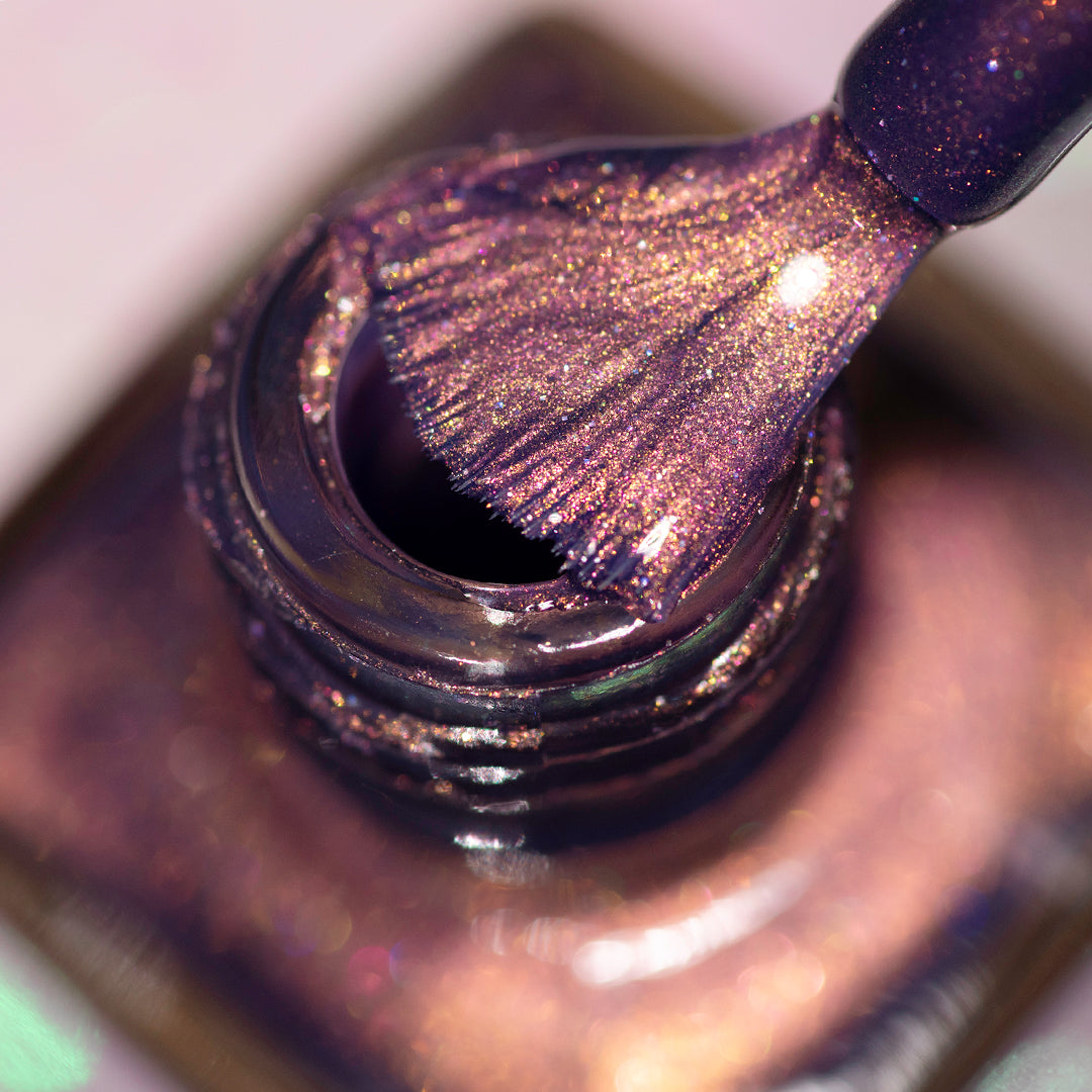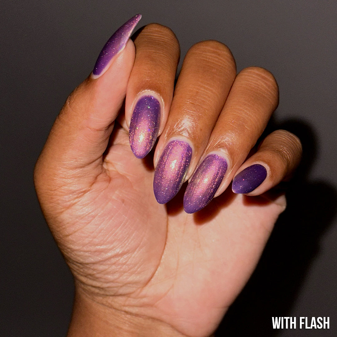 Will your nails answer the Phantom Call? Take a risk by plunging into this hauntingly beautiful shimmering purple-mauve shade and resurface with an otherworldly underglow. With a powerful ethereal orange-to-pink micro-shimmer that shifts all the way through sunrise hues of yellow and green at hard angles (and a dash of scattered holo), she’s not like other purples.