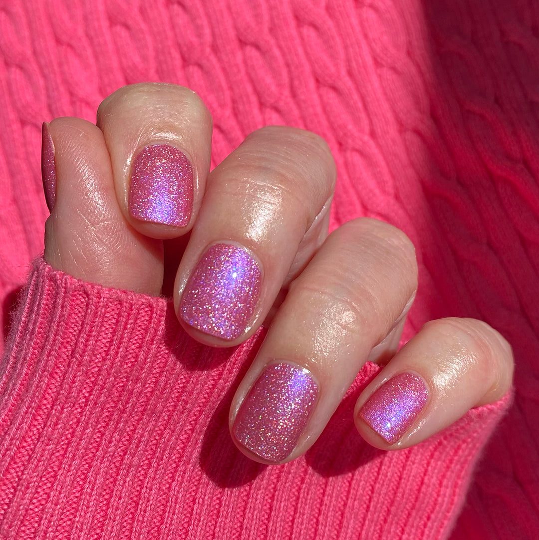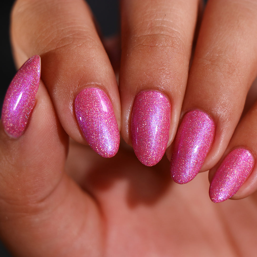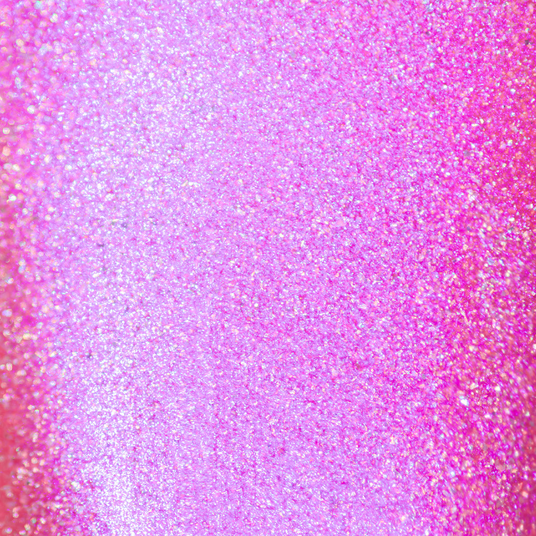 - Crushed holographic formula in a bubblegum pink shade with indigo-blue iridescent micro-shimmer underglow
