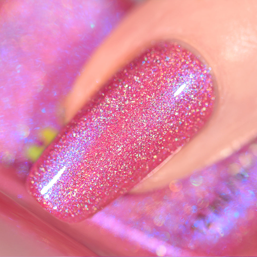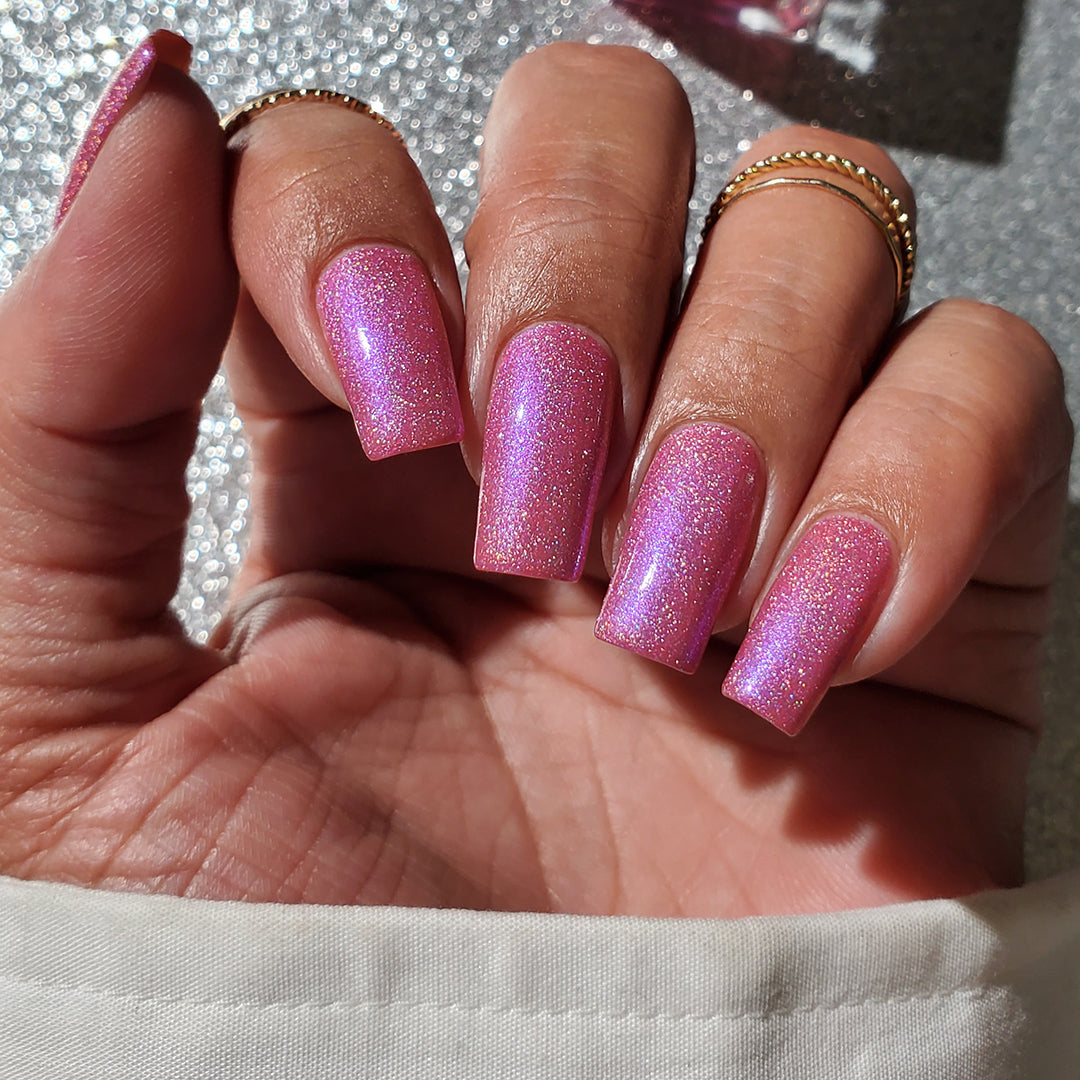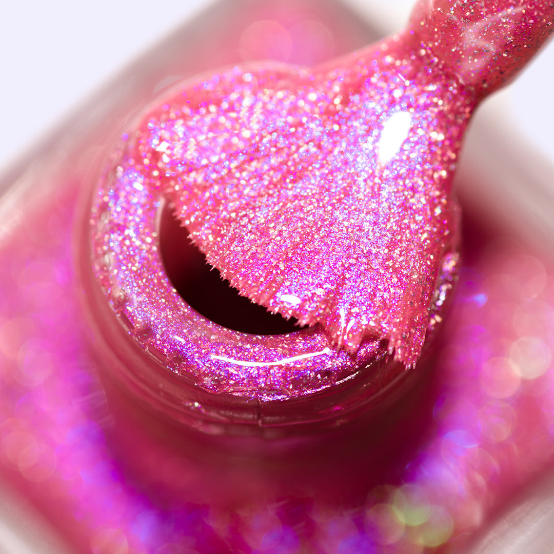 - Crushed holographic formula in a bubblegum pink shade with indigo-blue iridescent micro-shimmer underglow