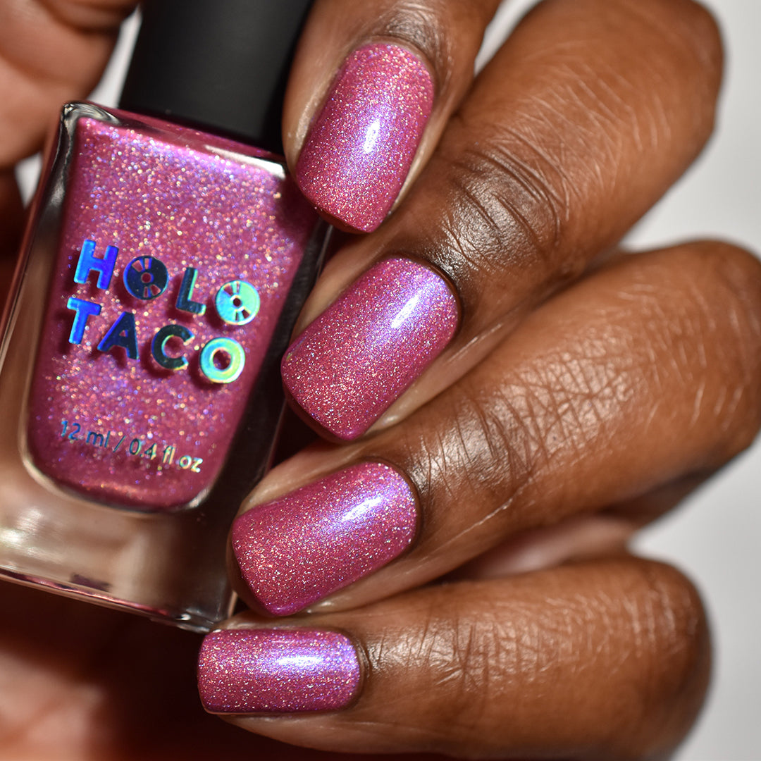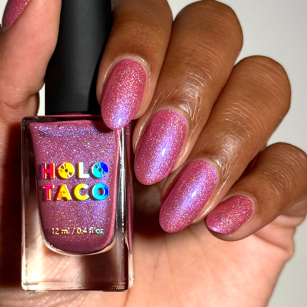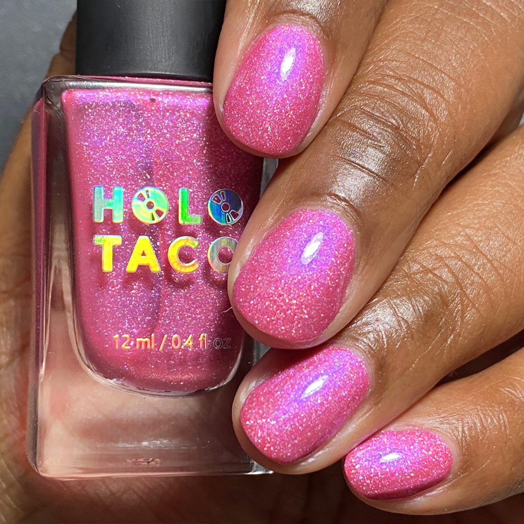 - Note: Holographic nail polish shows best under direct sunlight, halogen bulbs, or just your phone camera flash! Swatch photos as pictured have one coat of Glossy Taco.