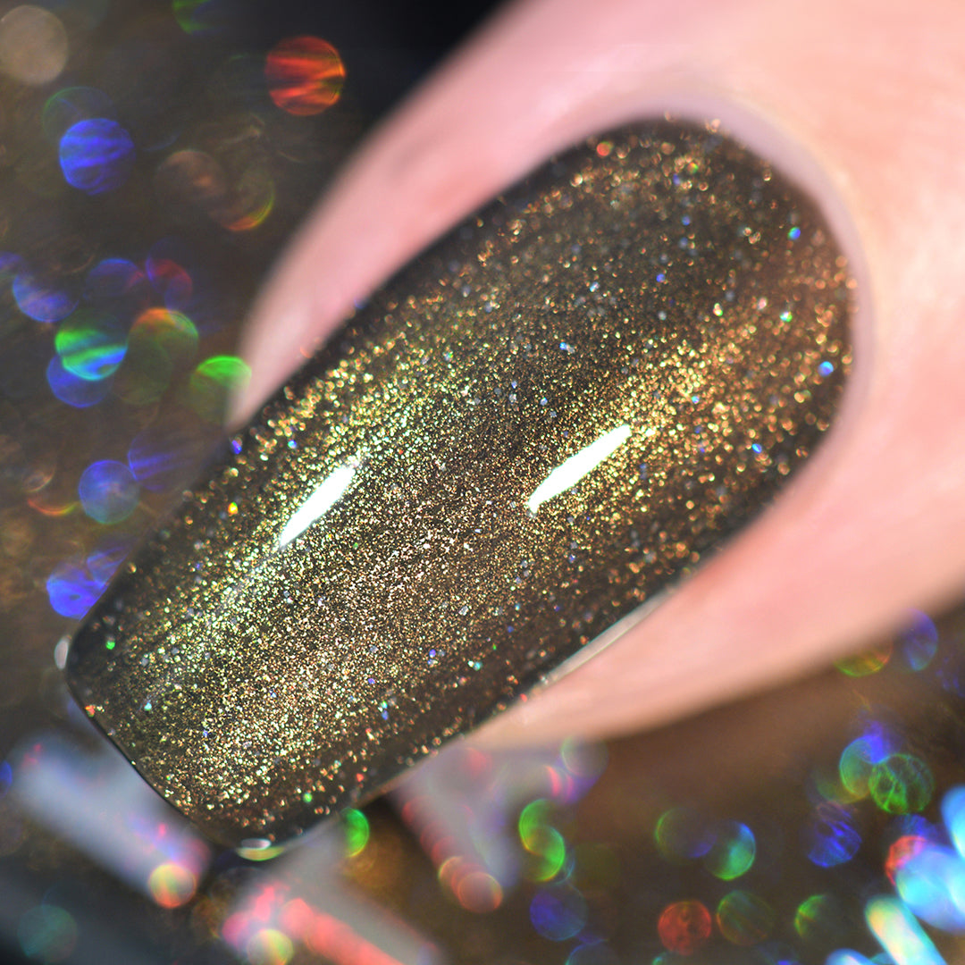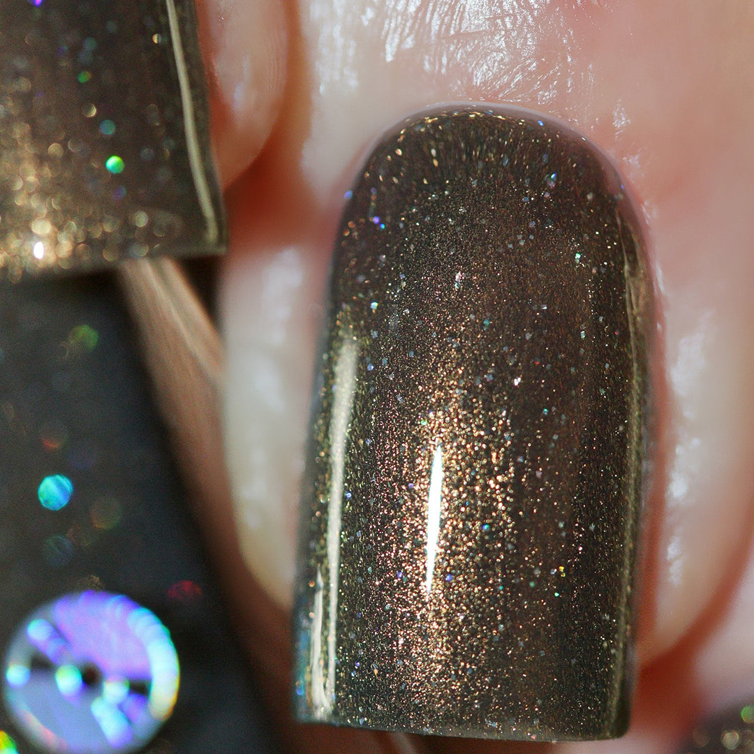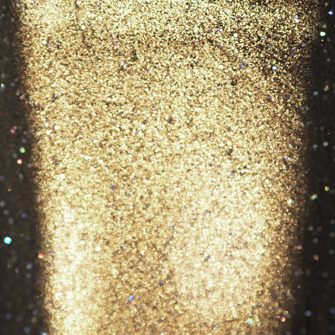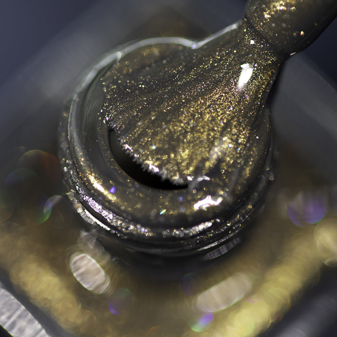 - Greige jelly base with gold-bronze beaming micro-shimmer and scattered holographic glitter