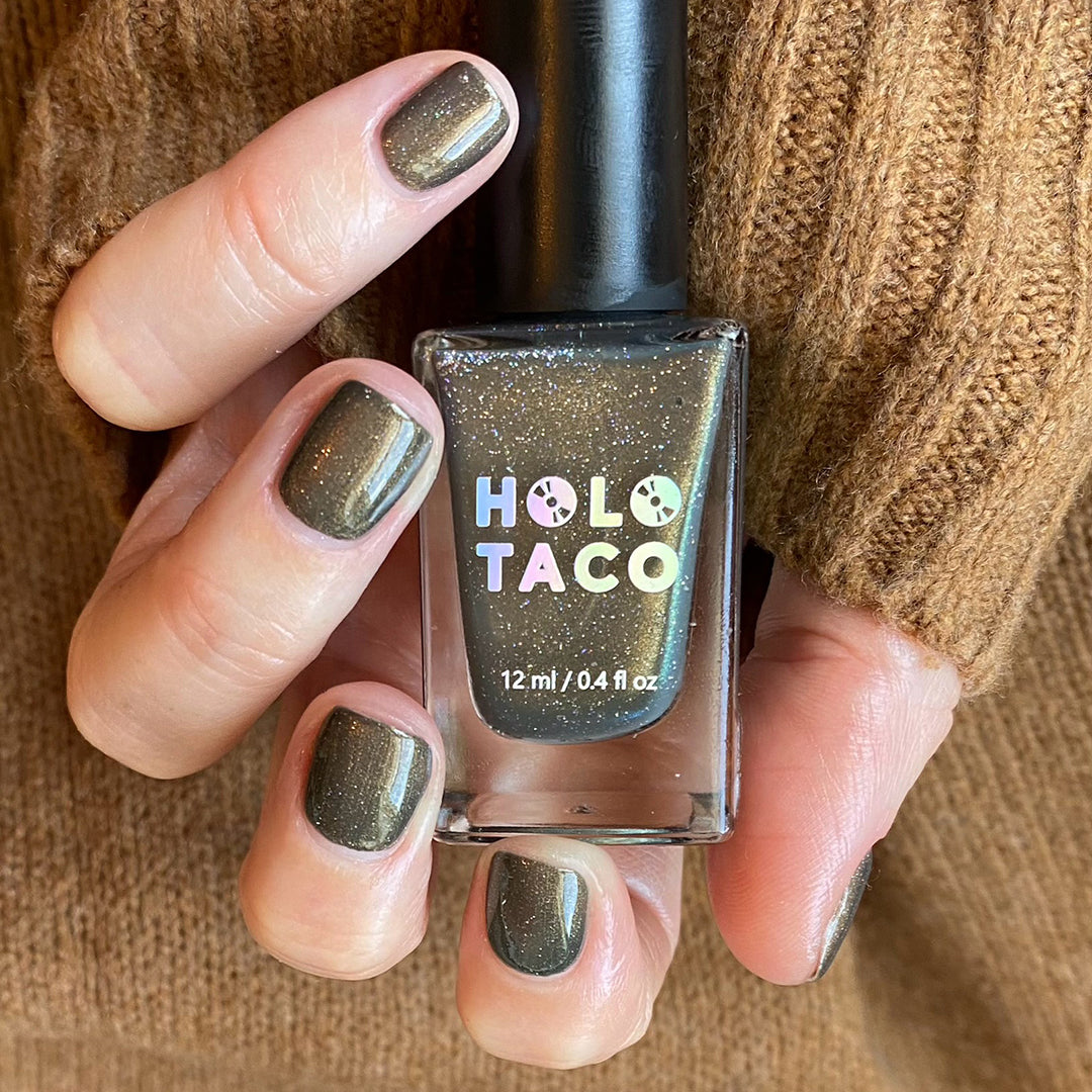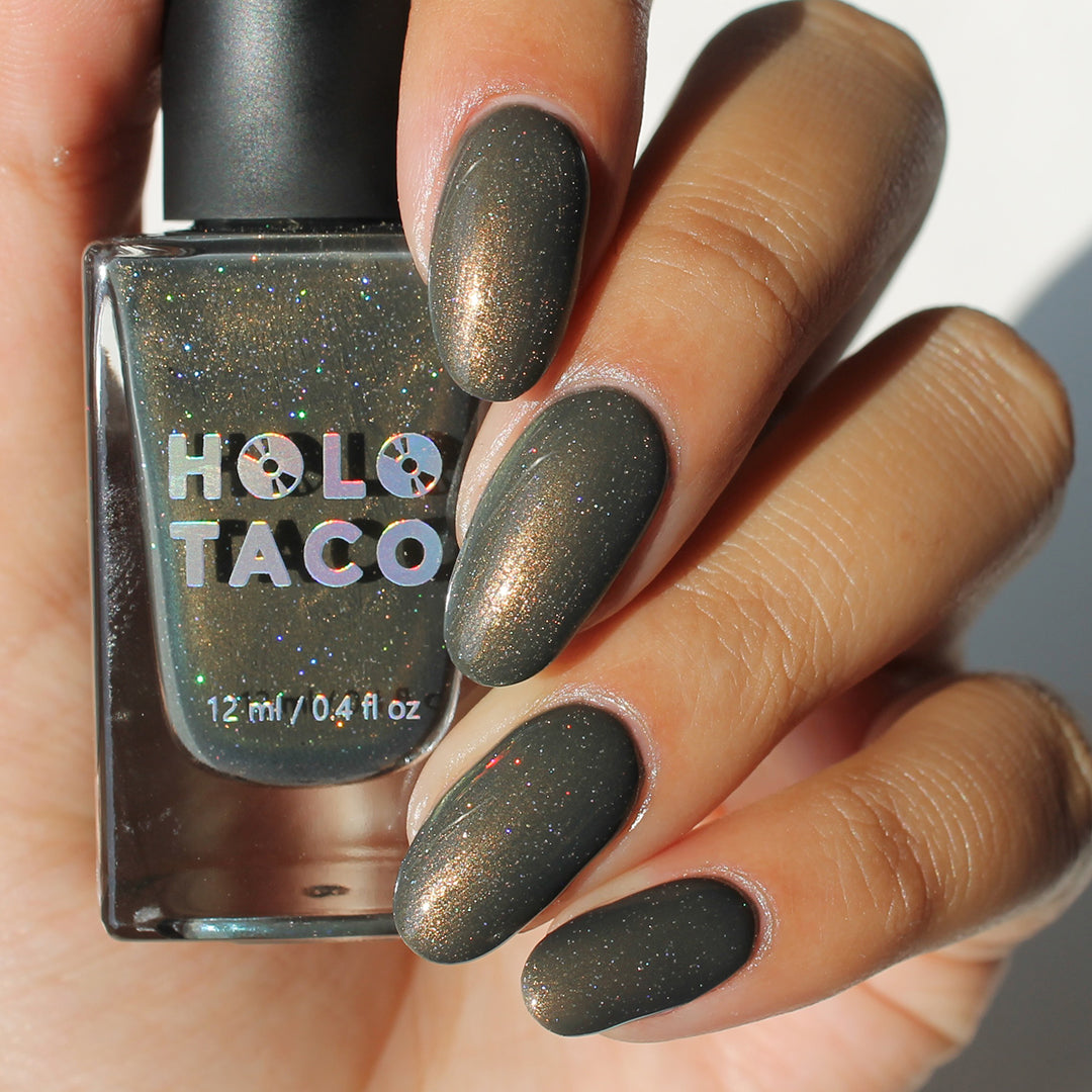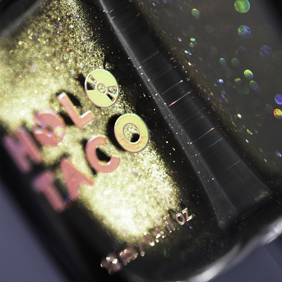 - Note: Holographic nail polish shows best under direct sunlight, halogen bulbs, or just your phone camera flash! Swatch photos as pictured have one coat of Glossy Taco for optimal smoothness and shine.