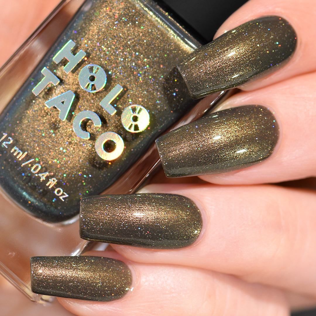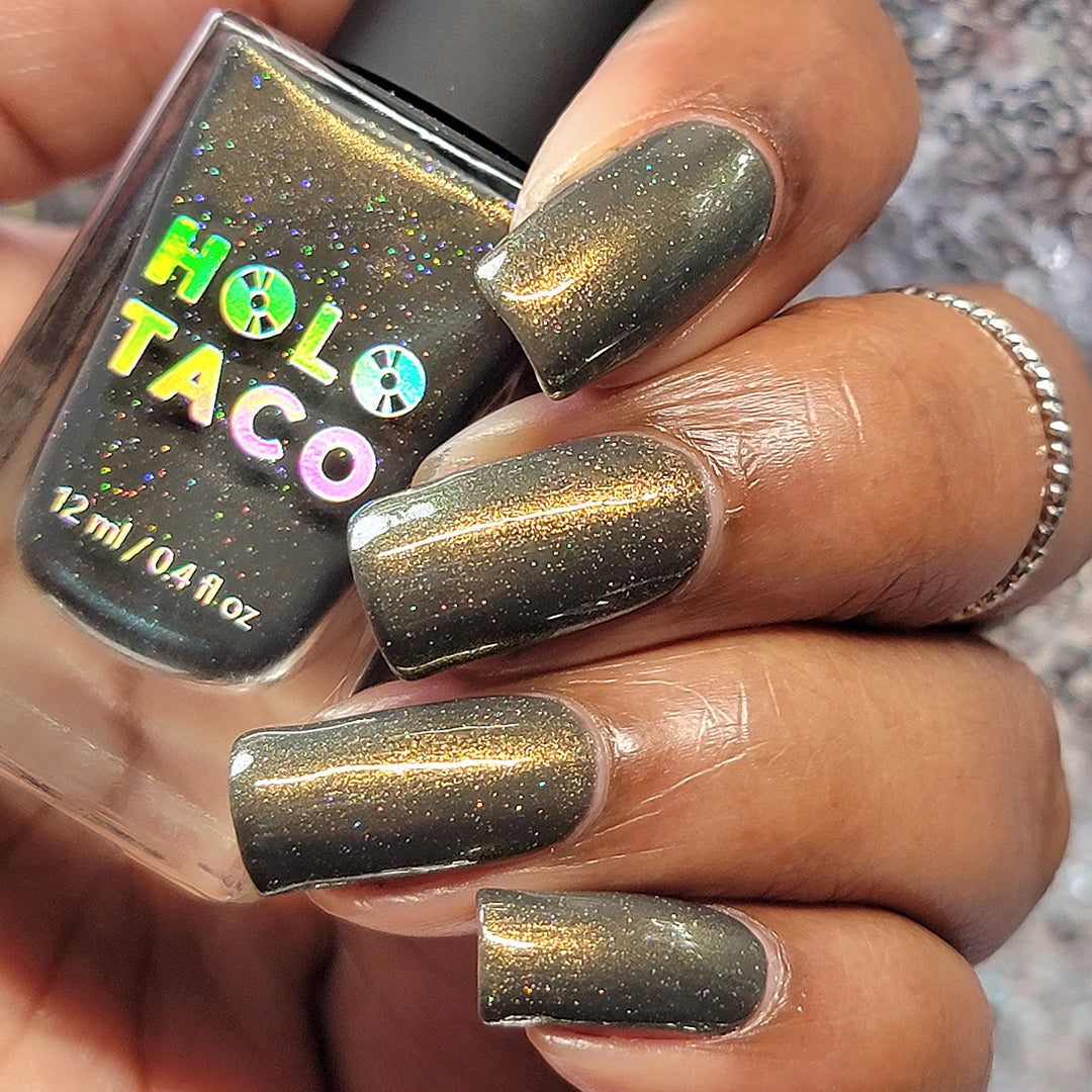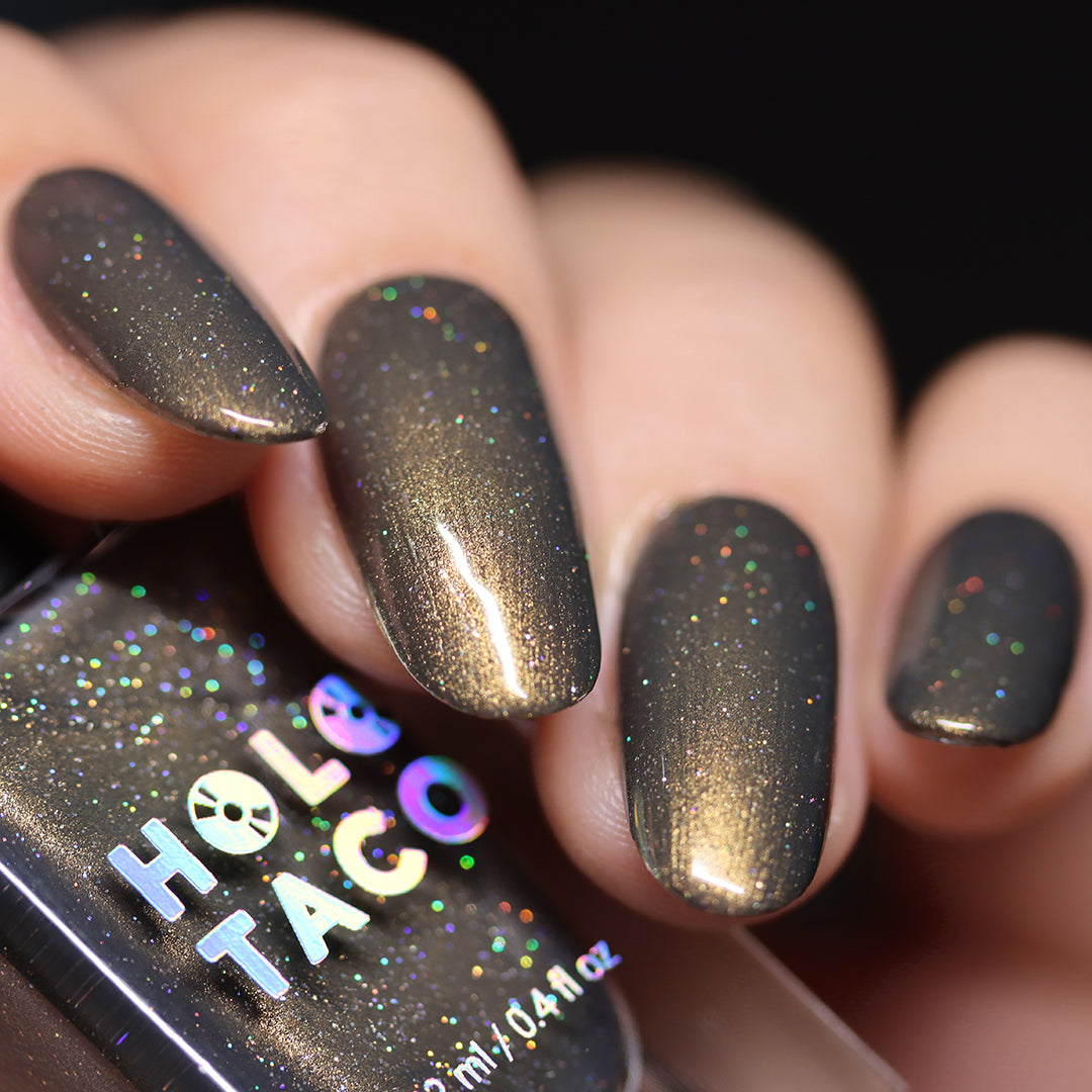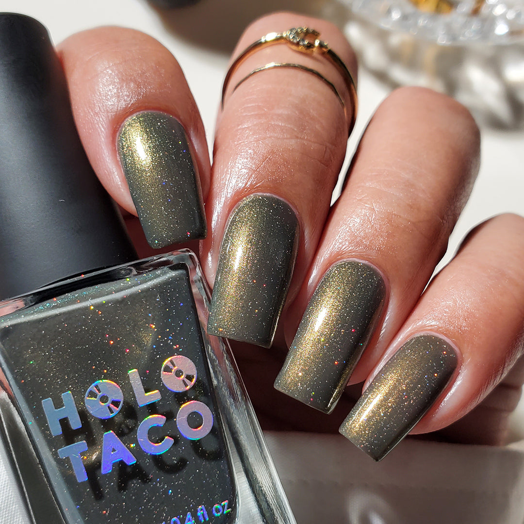 - Note: Holographic nail polish shows best under direct sunlight, halogen bulbs, or just your phone camera flash! Swatch photos as pictured have one coat of Glossy Taco for optimal smoothness and shine.