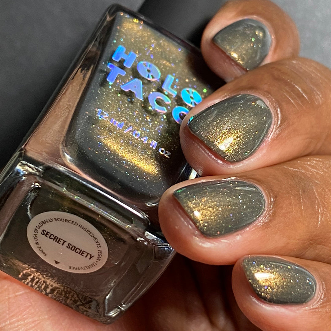 Join the academy’s most coveted club. The password…? Secret Society. Unlock the deepest of sparkling lore with this gleaming pewter-grey polish. Its golden taupe micro-shimmer and scattered holographic flecks are guaranteed to help distract others from your classified pursuits. We trust this intel will remain safe in your painted hands.