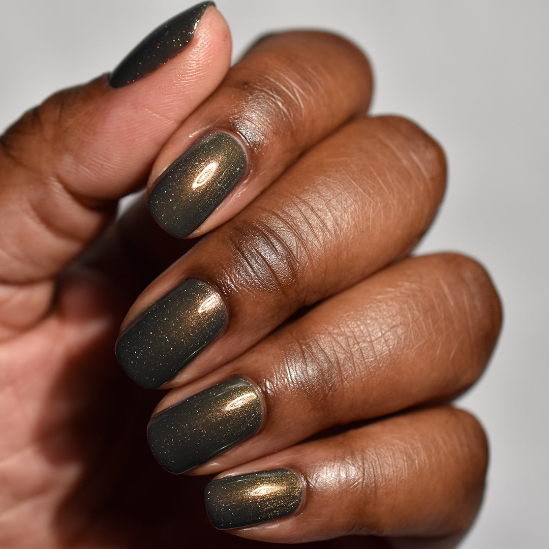 I was hoping that it would look like an antique metal, and it does! Most of the dark academia collection was even darker than I expected under a lot of lighting. So I had originally thought that this one might be too muted, but it ended up being the perfect shade that I was hoping for from, for example, inkwell. The formula was also very nice and easy to apply and remove. It will go nicely with a deep olive/military green fall outfit.