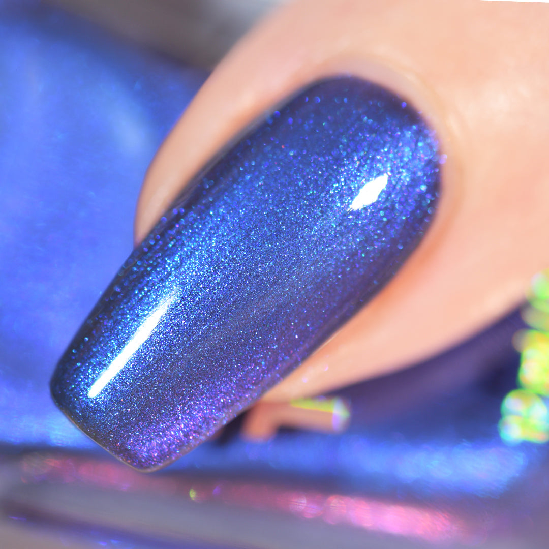 Dive deep into Shadow Lake. Take a moment for introspection as you sink into the cool and comforting darkness of this striking deep grey-blue shade. Watch its piercing blue iridescent micro-shimmer surface in a couple coats like a deep glow emanating from the bottom of a moonlit lake. Now to ask yourself: “how deep is your glow?”