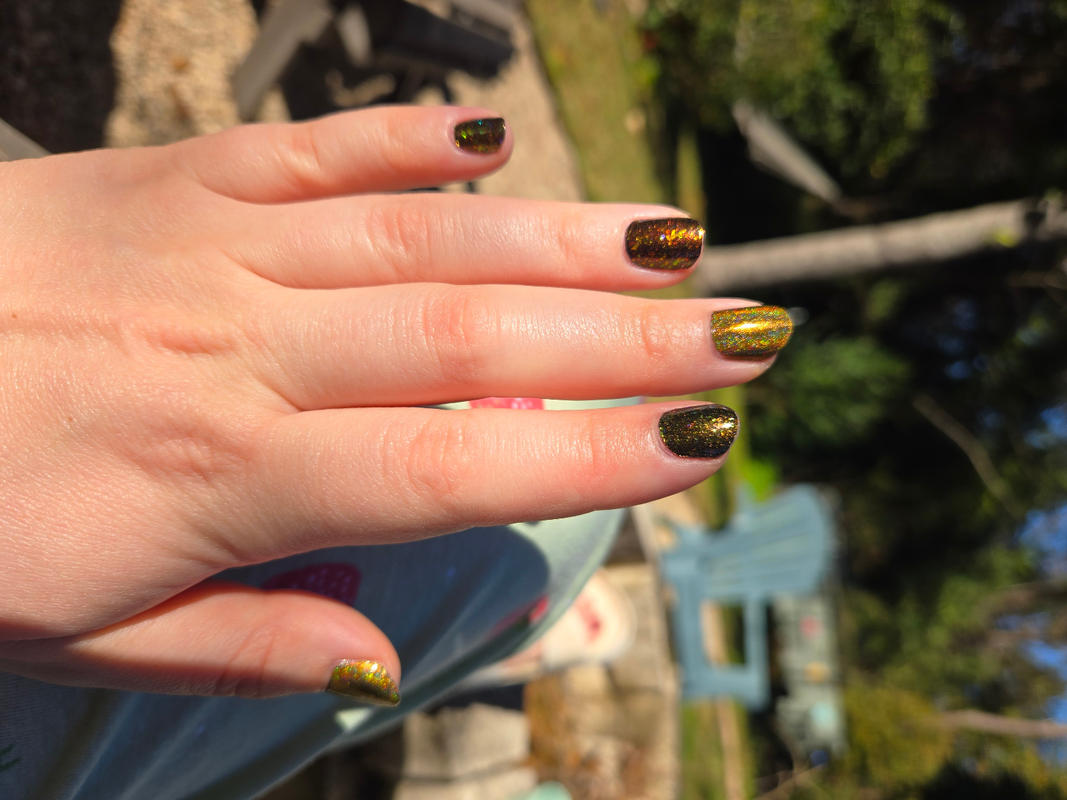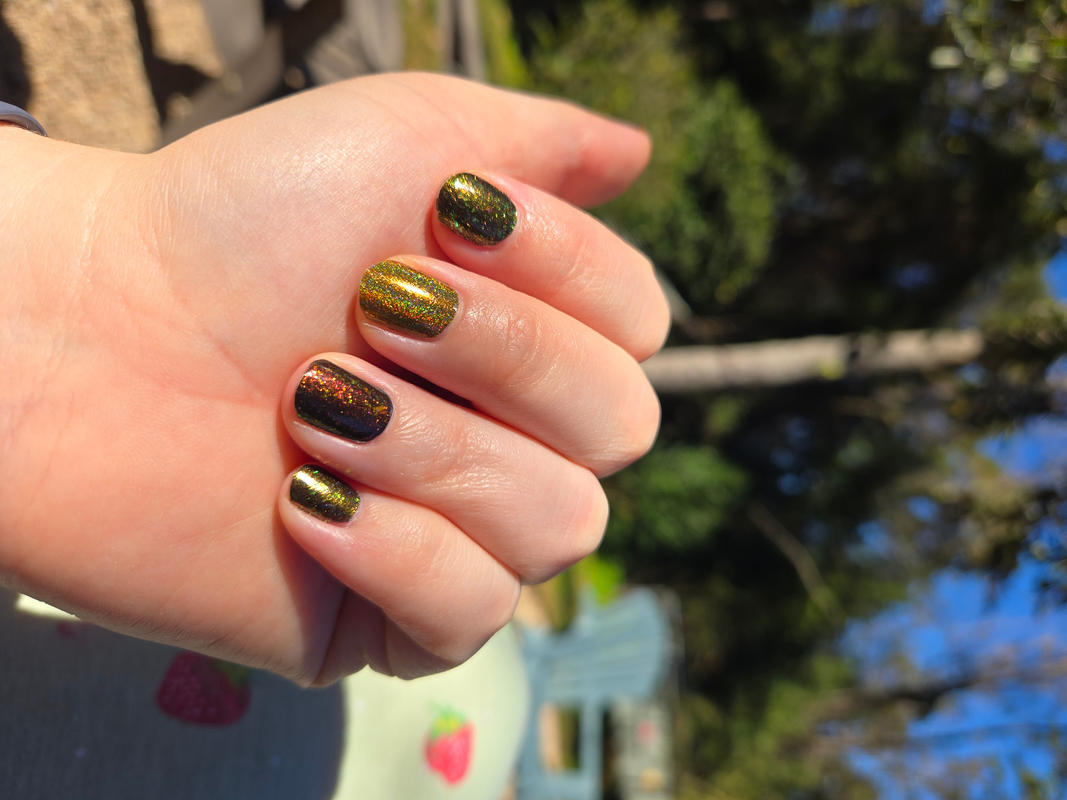 I wasn’t sure how I’d feel about this one but it is so beautiful and shifty. It is probably my favorite color in my entire order. I tried it on plain and it was beautiful, but over this green I am obsessed. This was just one coat.