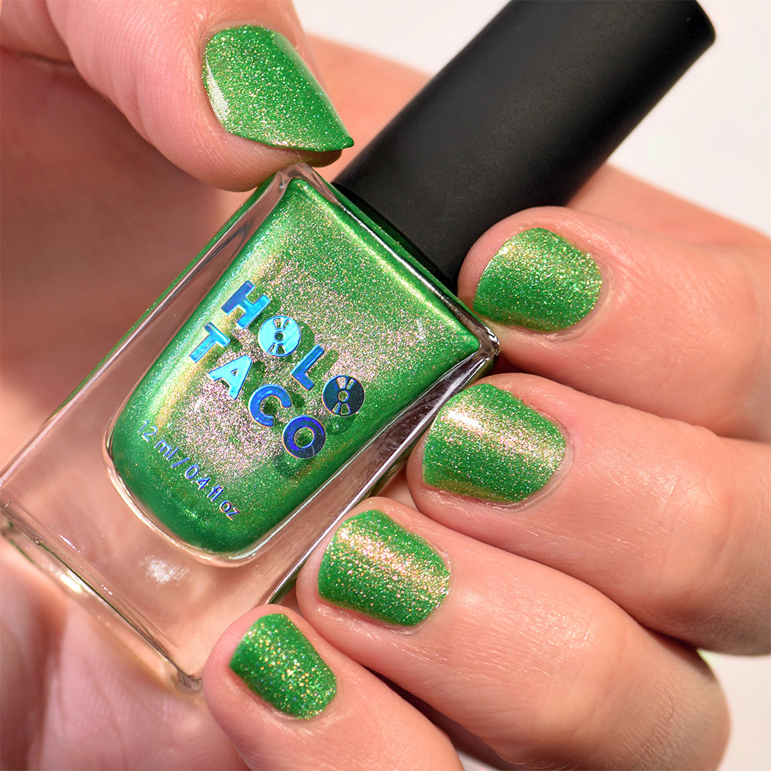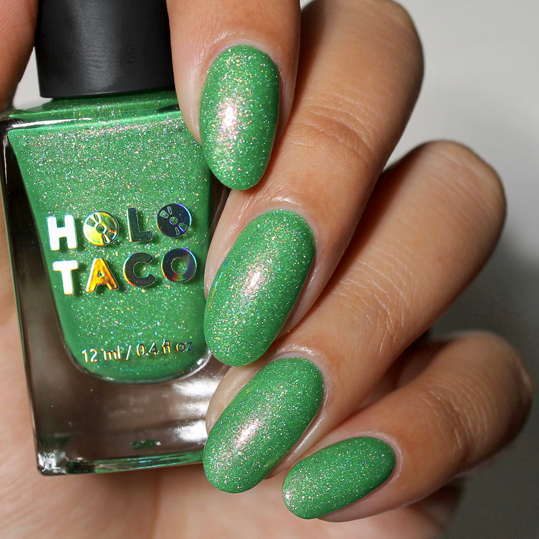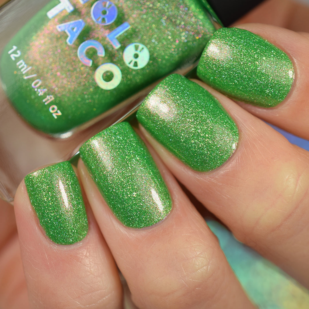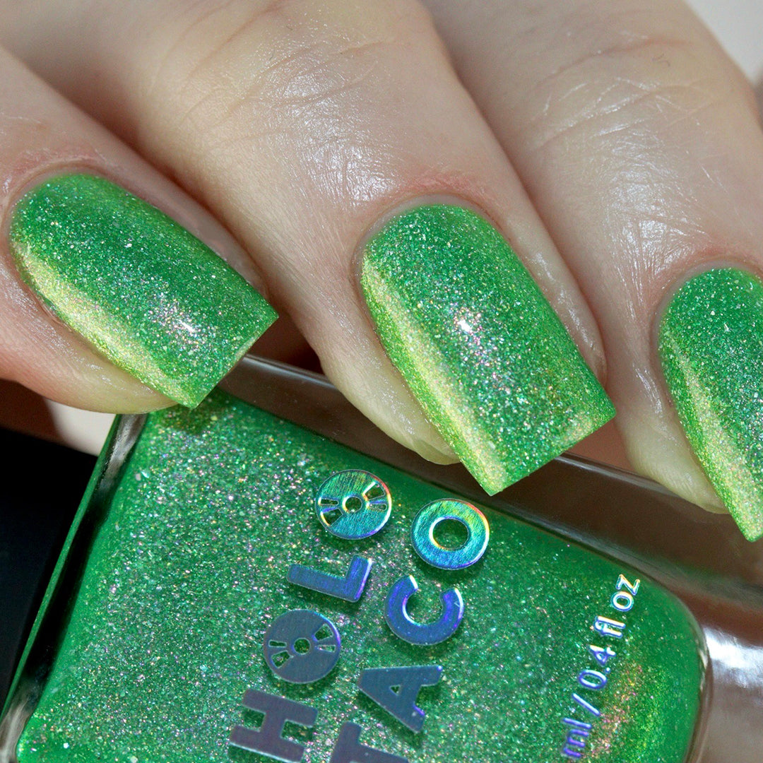 - Note: Holographic nail polish shows best under direct sunlight, halogen bulbs, or just your phone camera flash! Swatch photos as pictured have one coat of Glossy Taco.