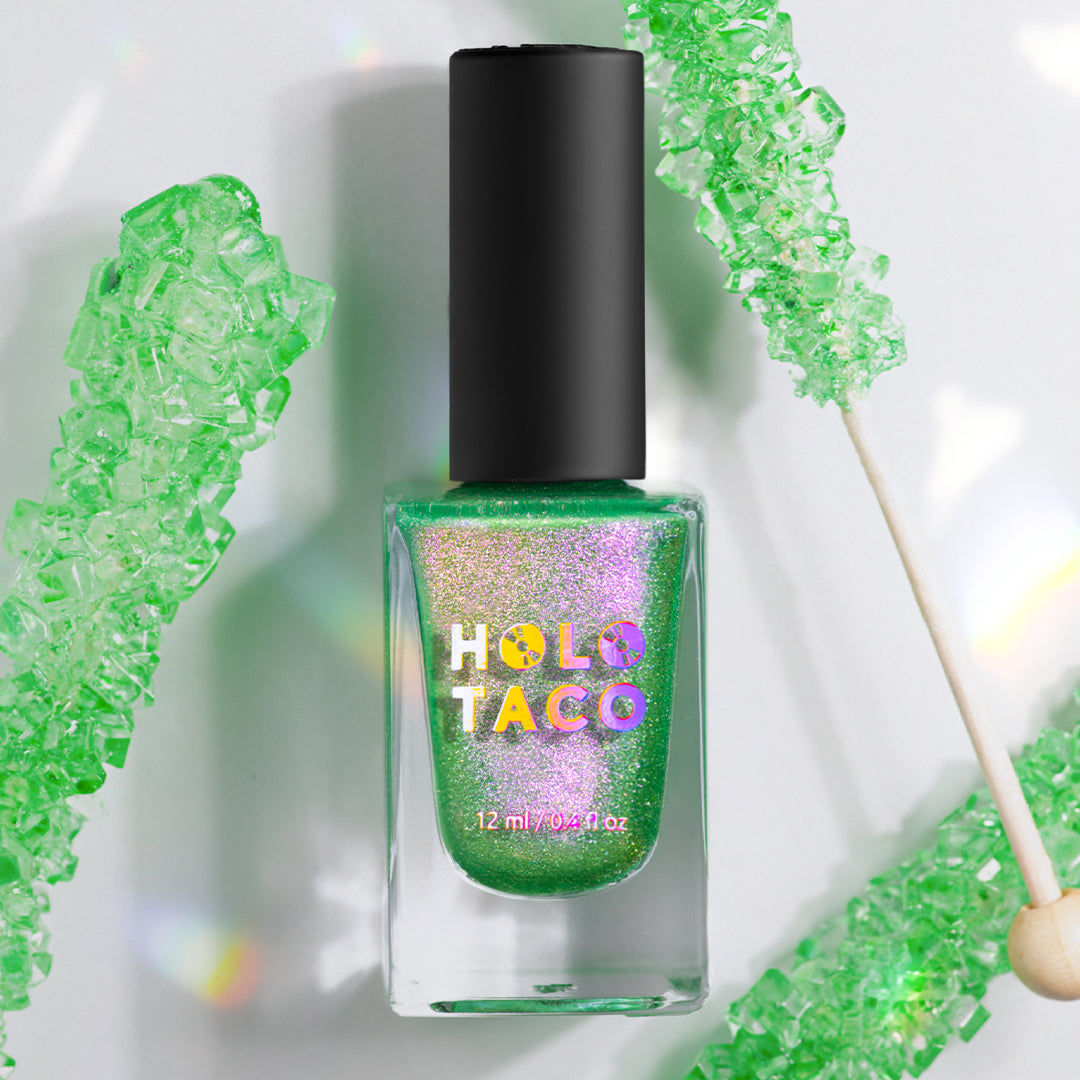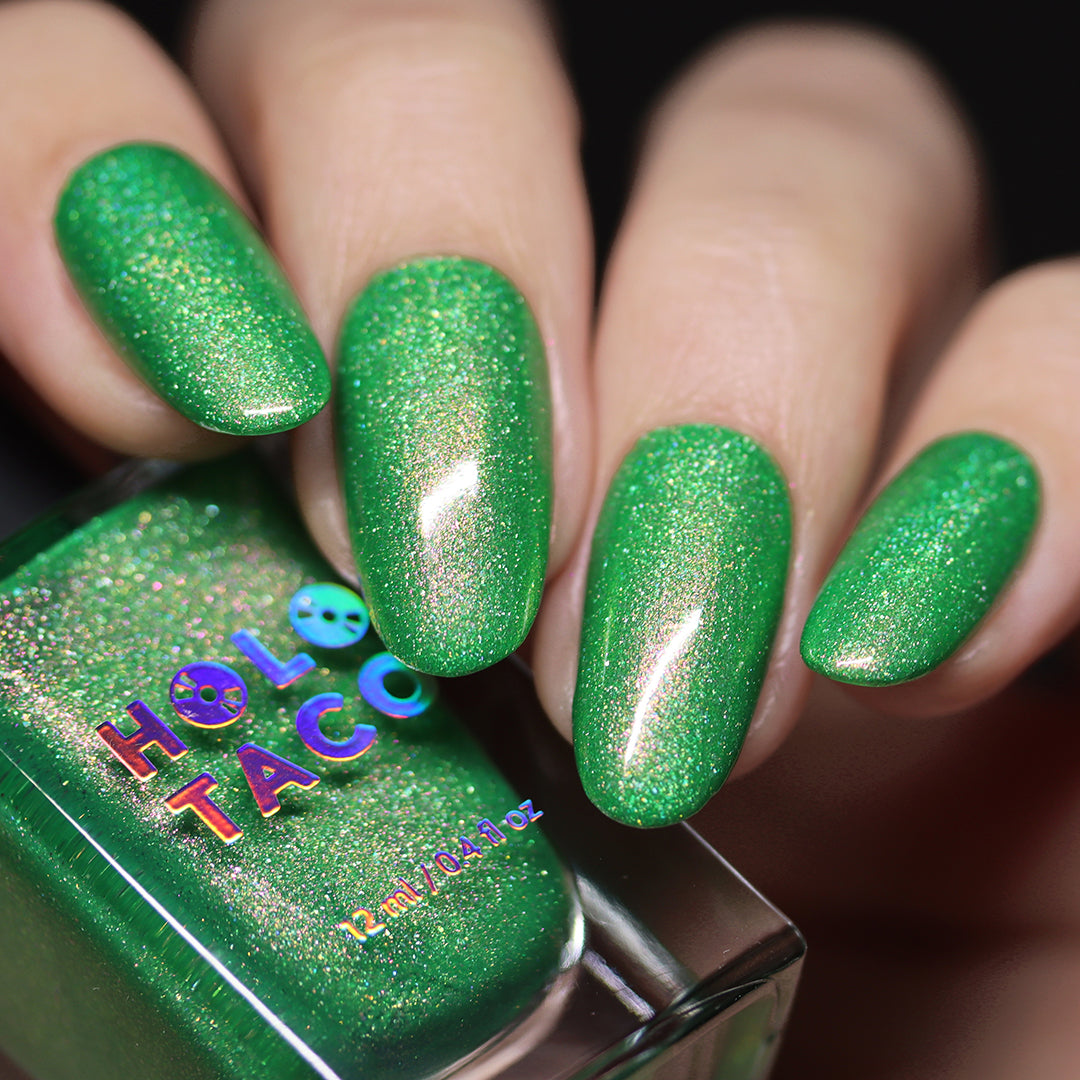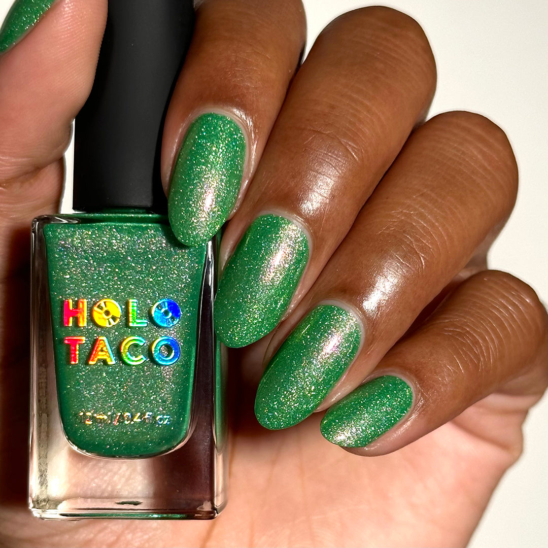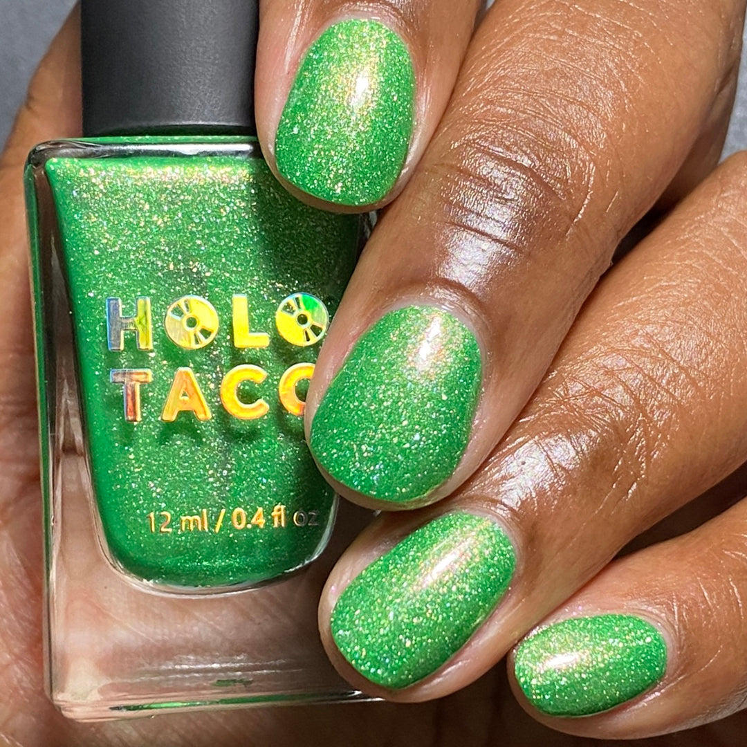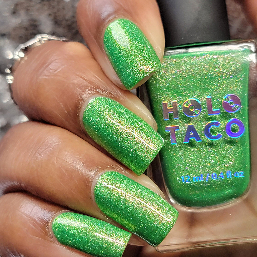 - Note: Holographic nail polish shows best under direct sunlight, halogen bulbs, or just your phone camera flash! Swatch photos as pictured have one coat of Glossy Taco.