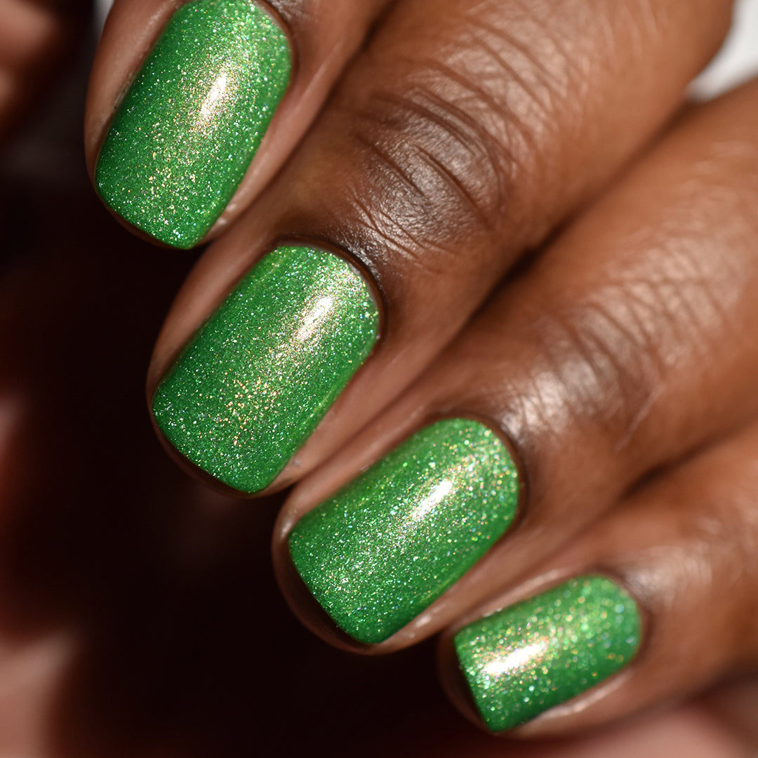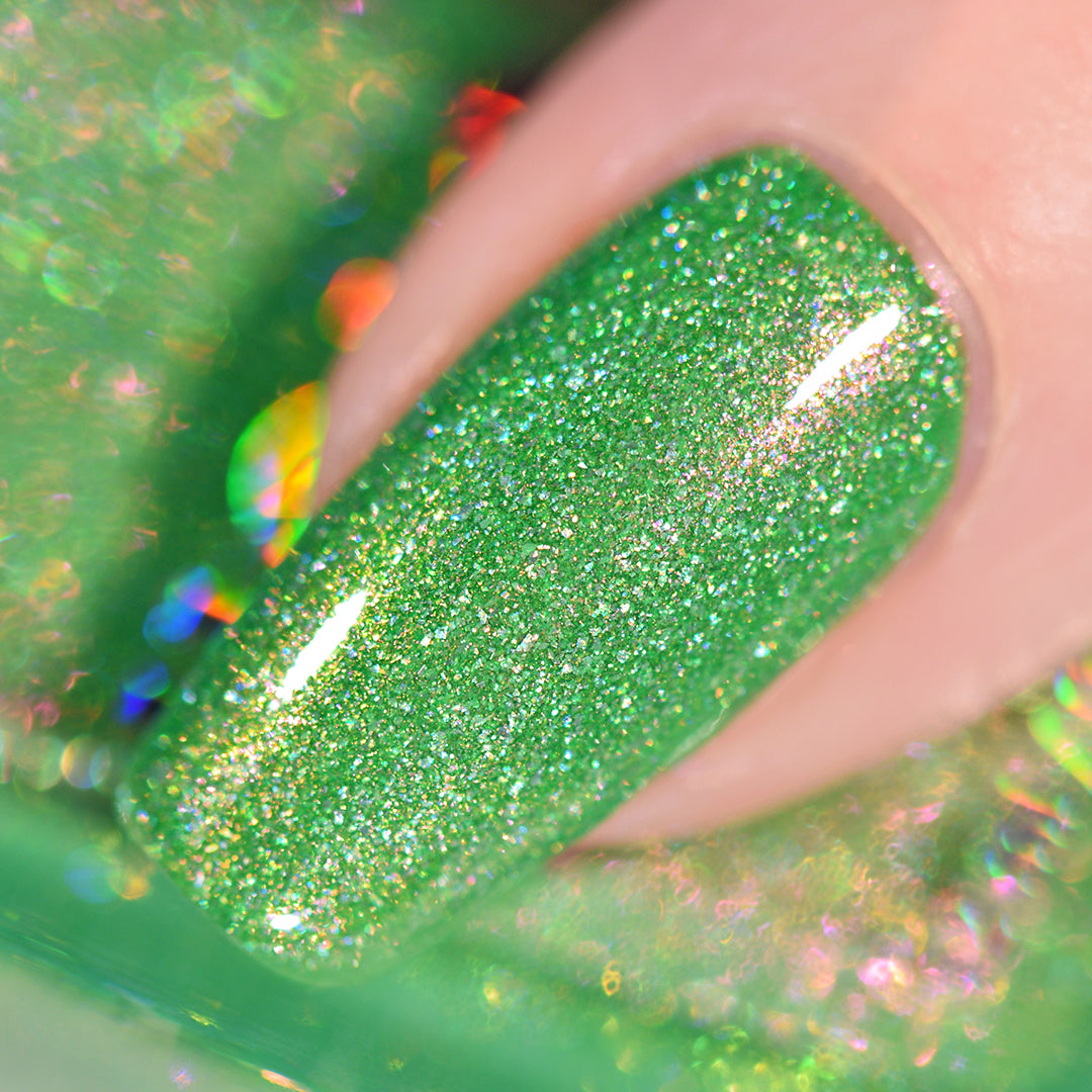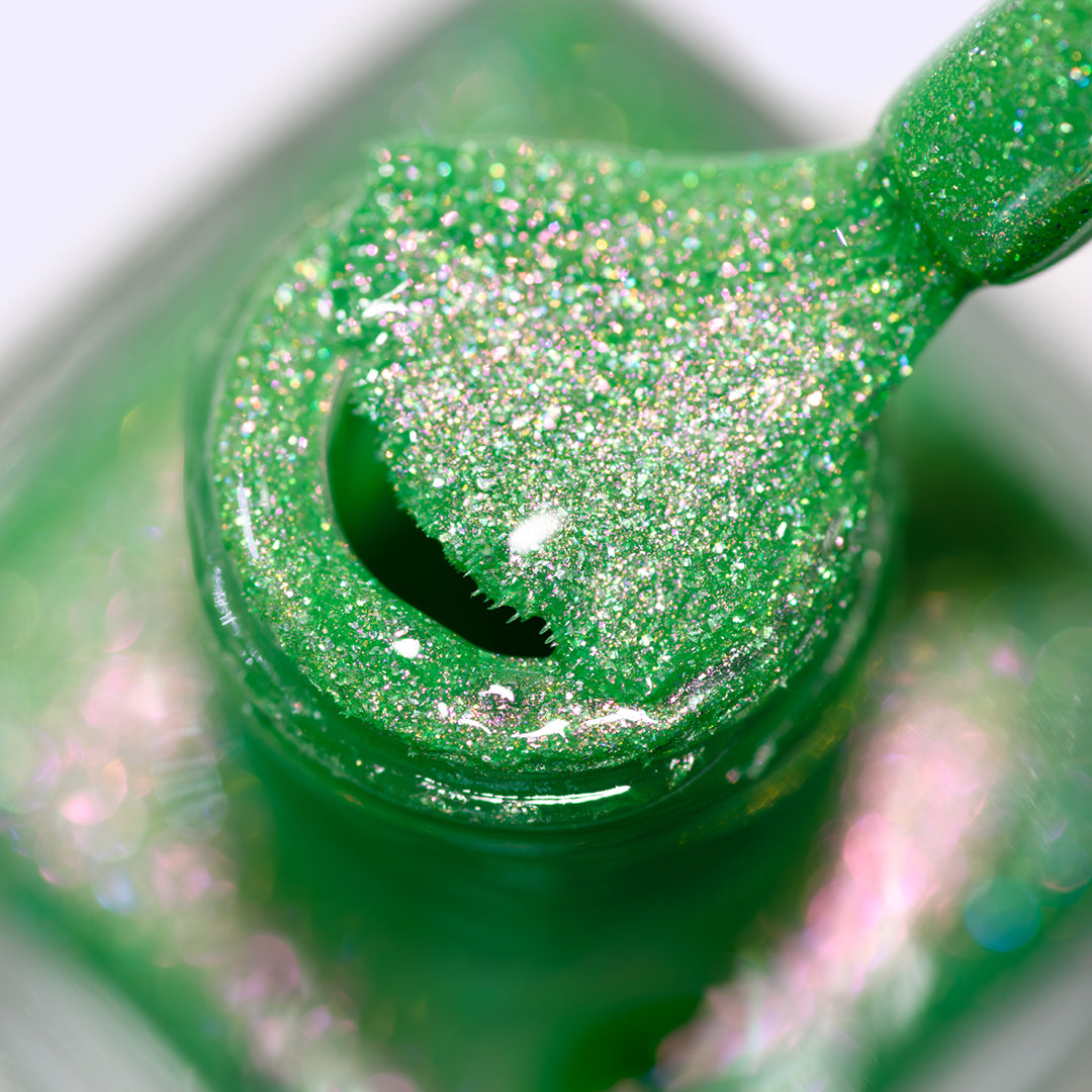 - Crushed holographic formula in a green shade with pink-yellow iridescent micro-shimmer underglow