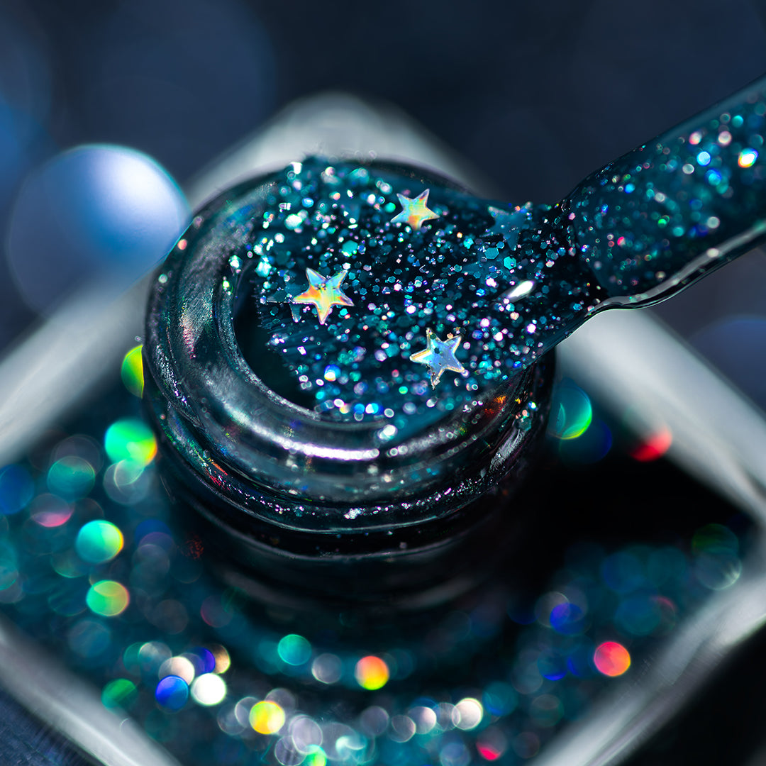 I love this teal holo glitter! Perfect deep ocean color, emerald green, but also peacock blue and SO HOLO. The stars as glitters incorporated inside the polish is what I have beef with. If you get any on the first coat, they are completely wasted under the next 2 layers of jelly. I prefer the regular holohex glitter formula, but the holographic stars, when they end up ontop are super cool, would be neat as a separate dry glitter for placements.