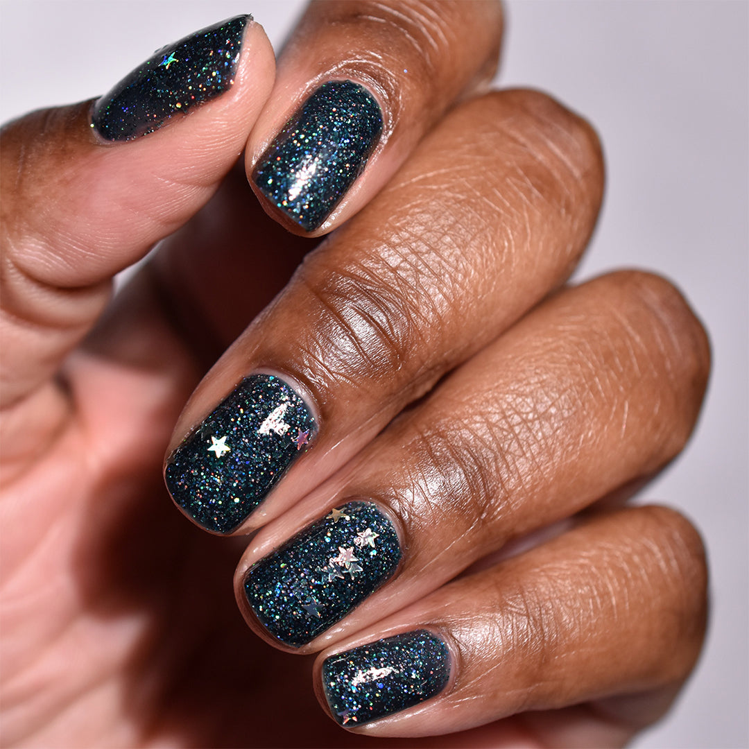 This is a beautiful Polish! The stars are somewhat sparse, so in order to get them on each nail, leave the polish upside down for as long as possible before painting. You could also dig out and place the stars, but I didn’t have to. I really loved the color and t her formula was pretty easy to work with. Would buy it again :)