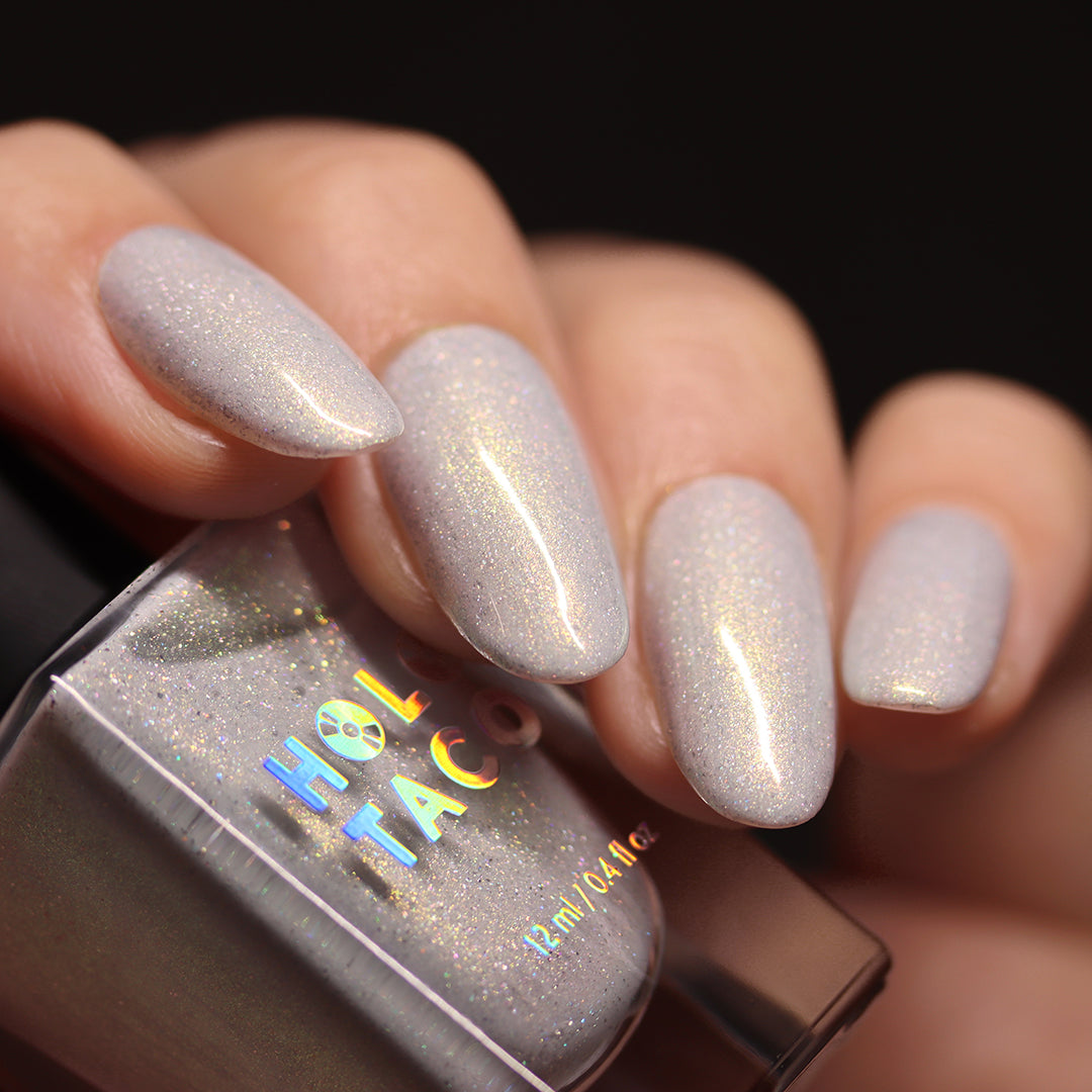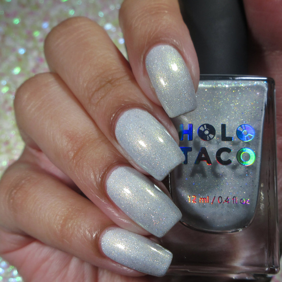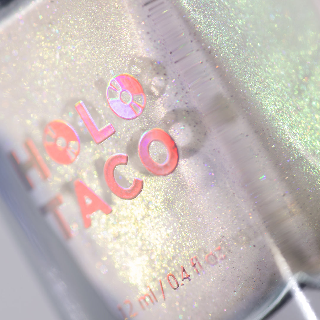 - Note: Holographic nail polish shows best under direct sunlight, halogen bulbs, or just your phone camera flash! Swatch photos as pictured have one coat of Glossy Taco.