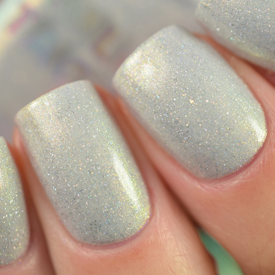 - Crushed holographic formula in an off-white shade with yellow-orange iridescent micro-shimmer underglow