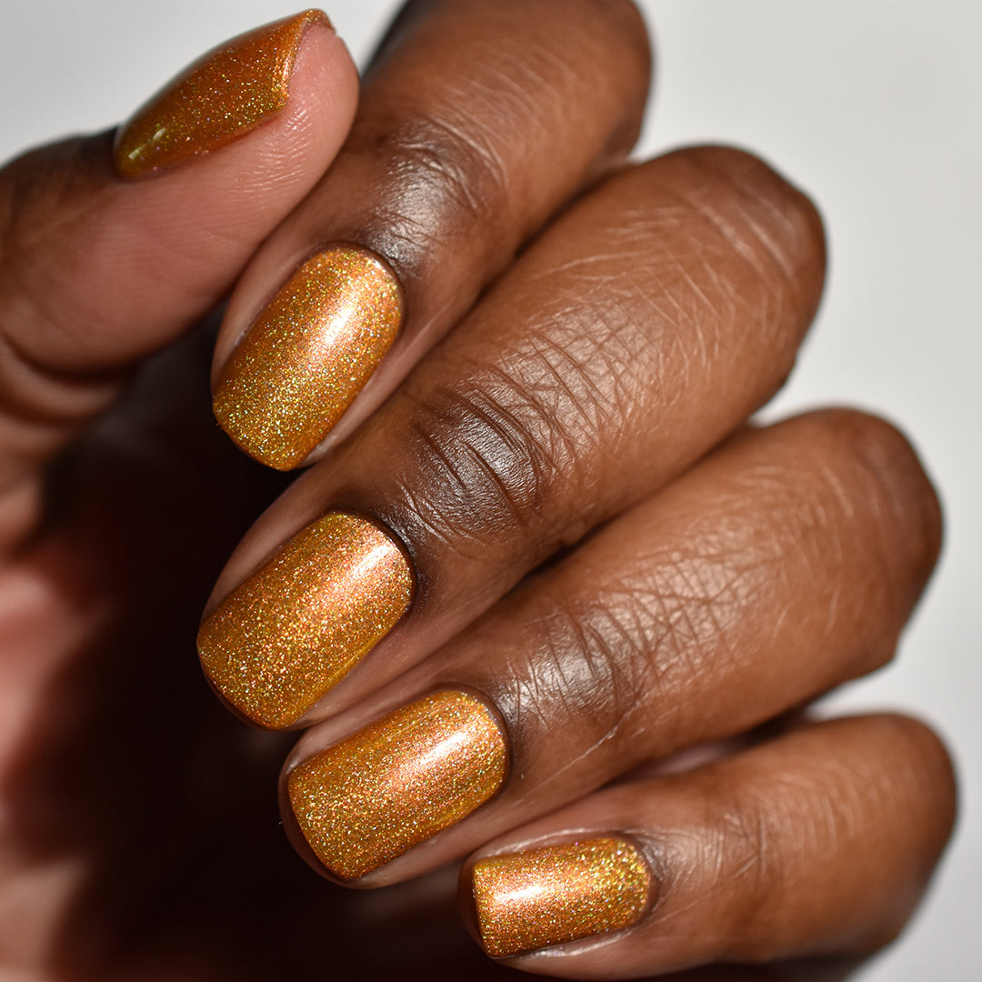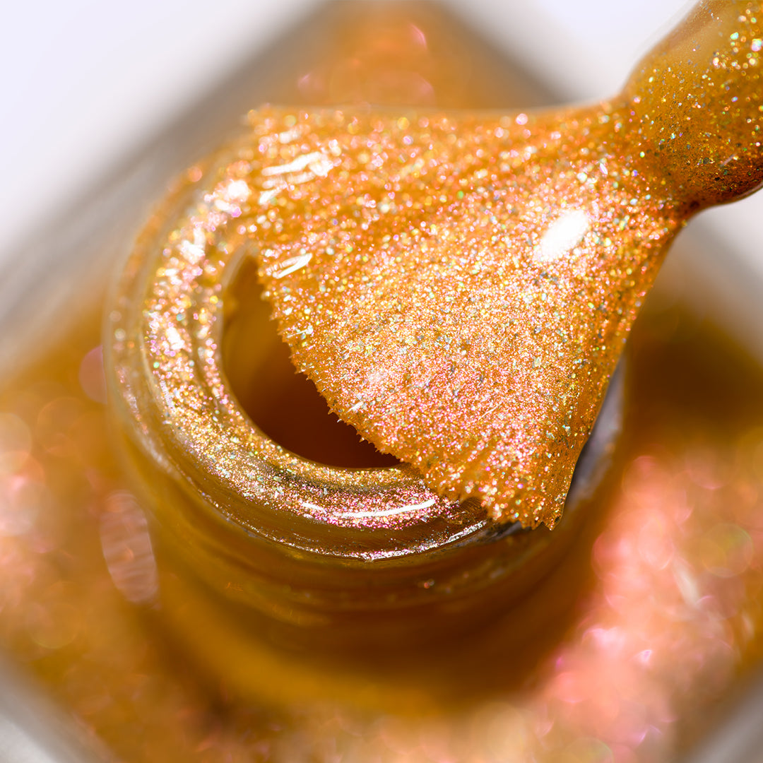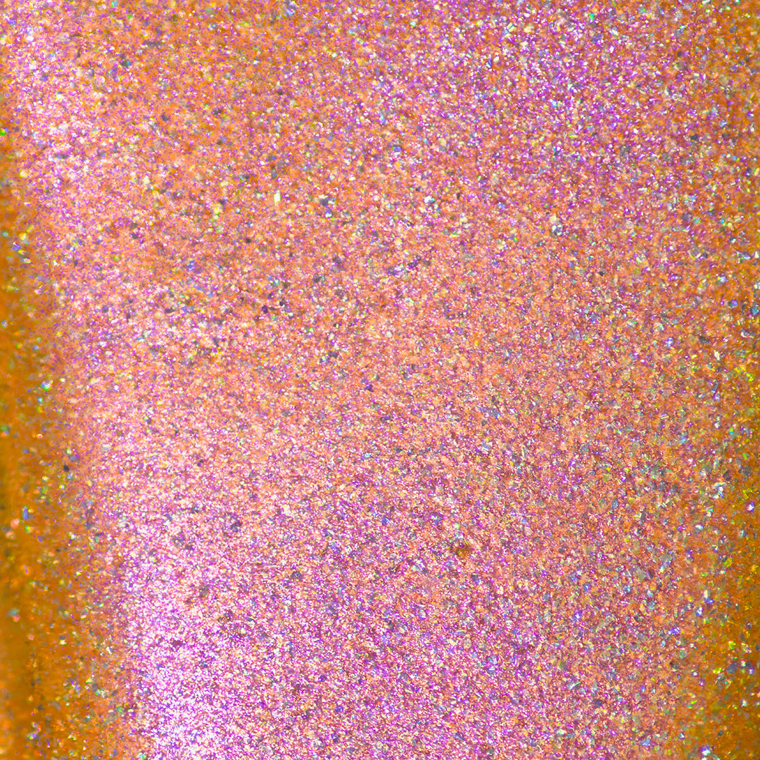 - Crushed holographic formula in a warm golden yellow shade with orange-pink iridescent micro-shimmer underglow