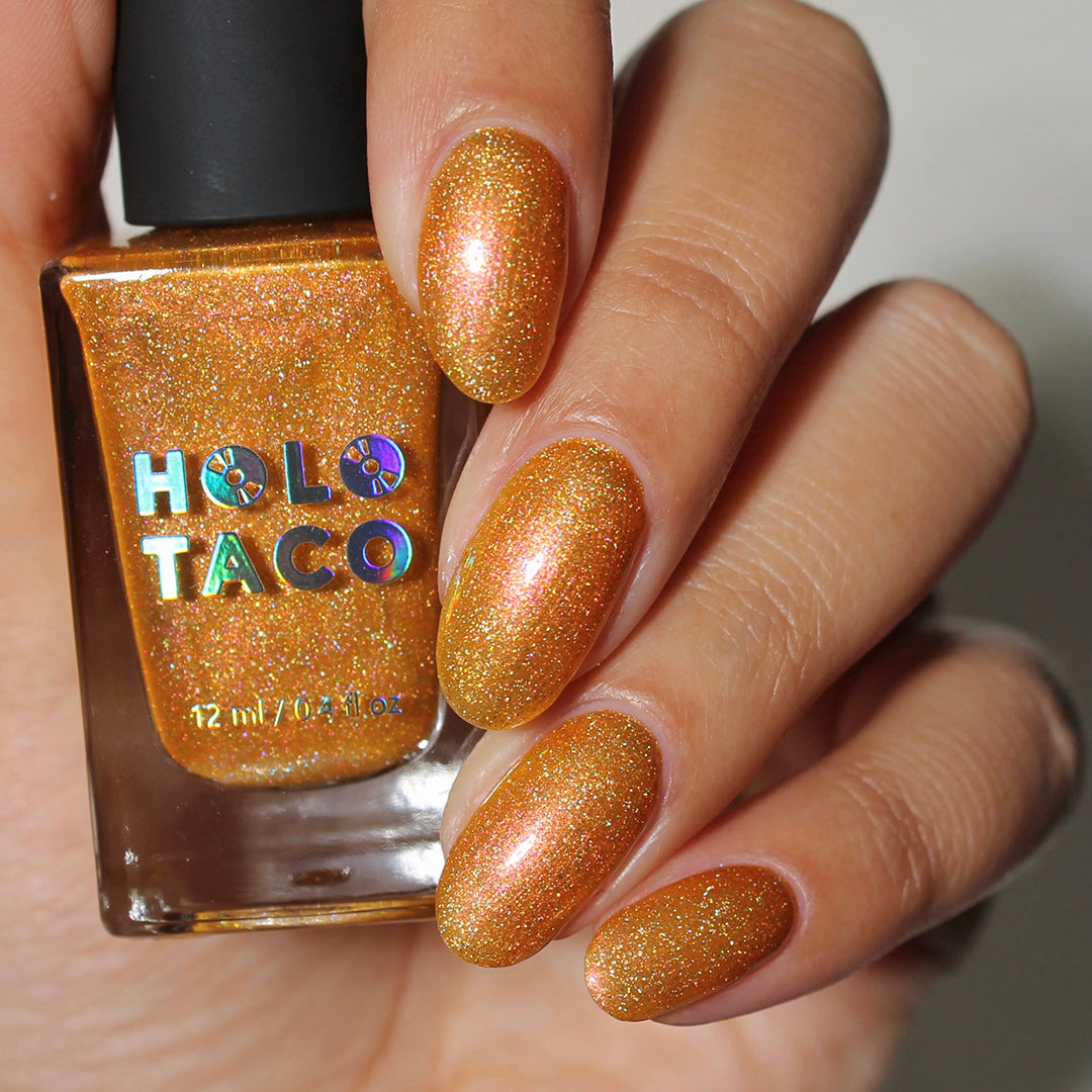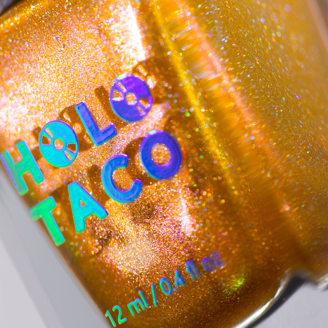 - Note: Holographic nail polish shows best under direct sunlight, halogen bulbs, or just your phone camera flash! Swatch photos as pictured have one coat of Glossy Taco.