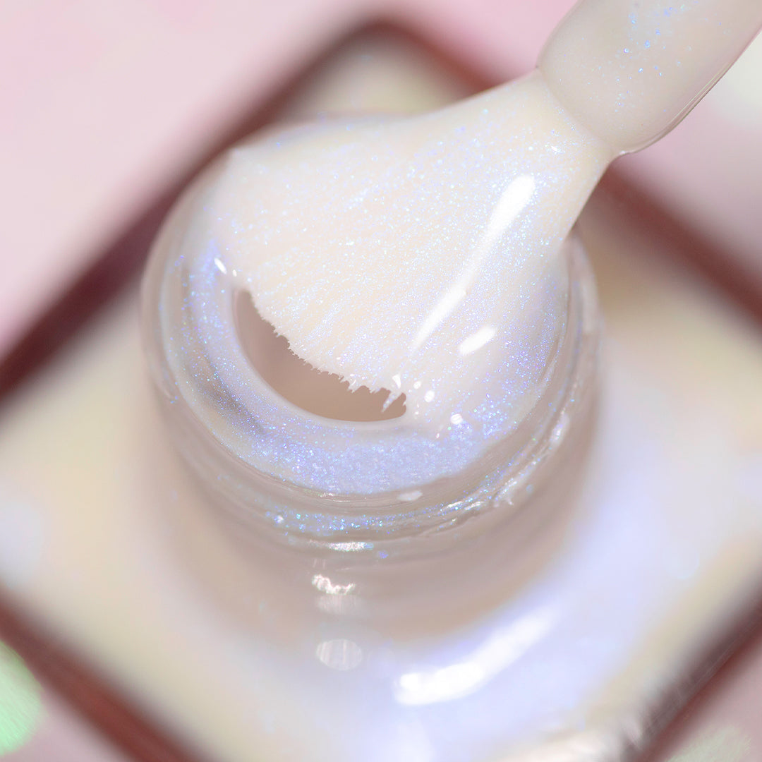 - Sheer white jelly base with iridescent blue micro-shimmer