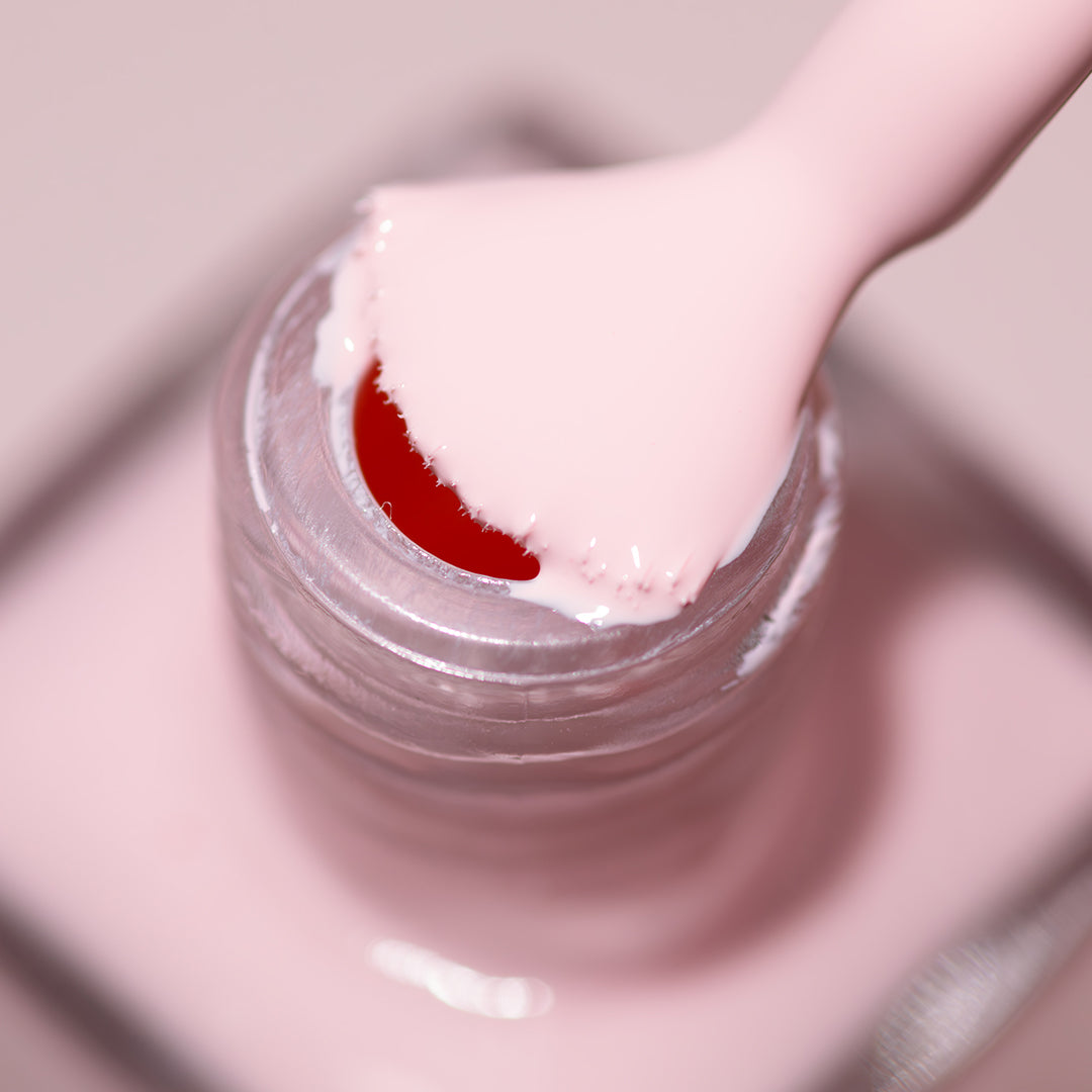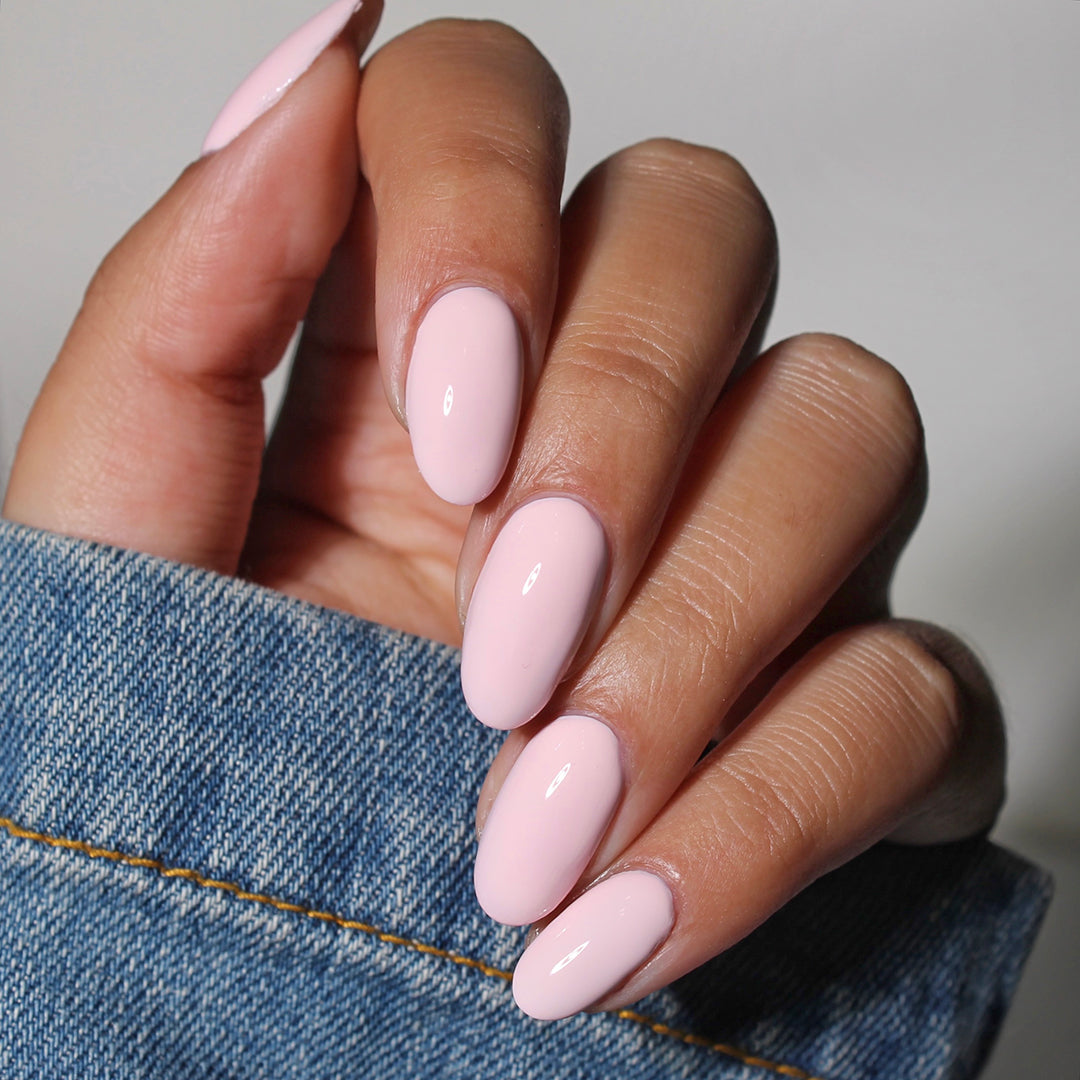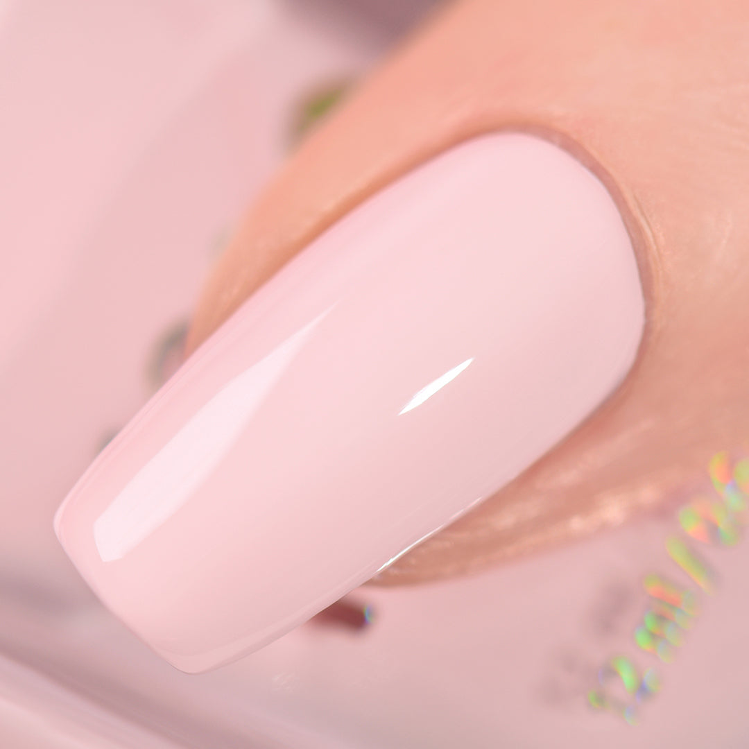 Pretty light pink cream. It's opaque in 2-3 coats and is a great shade to use with toppers!
