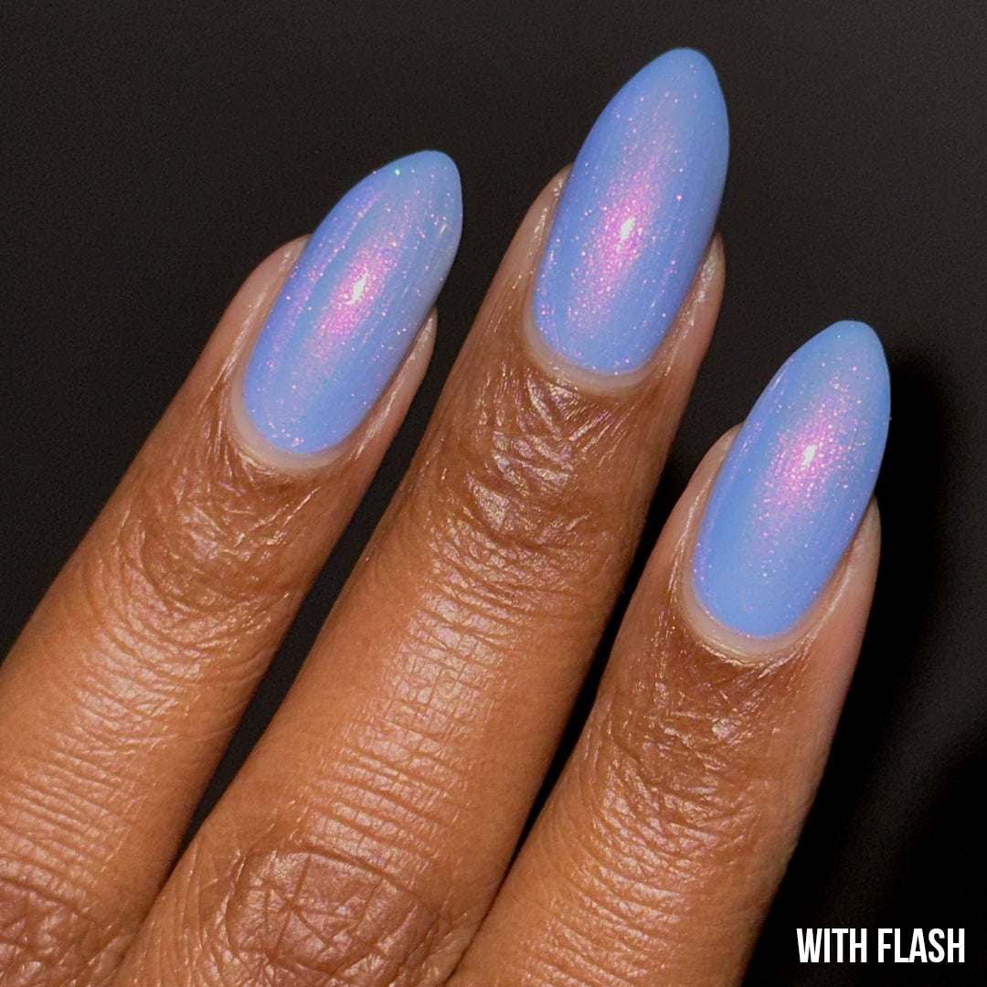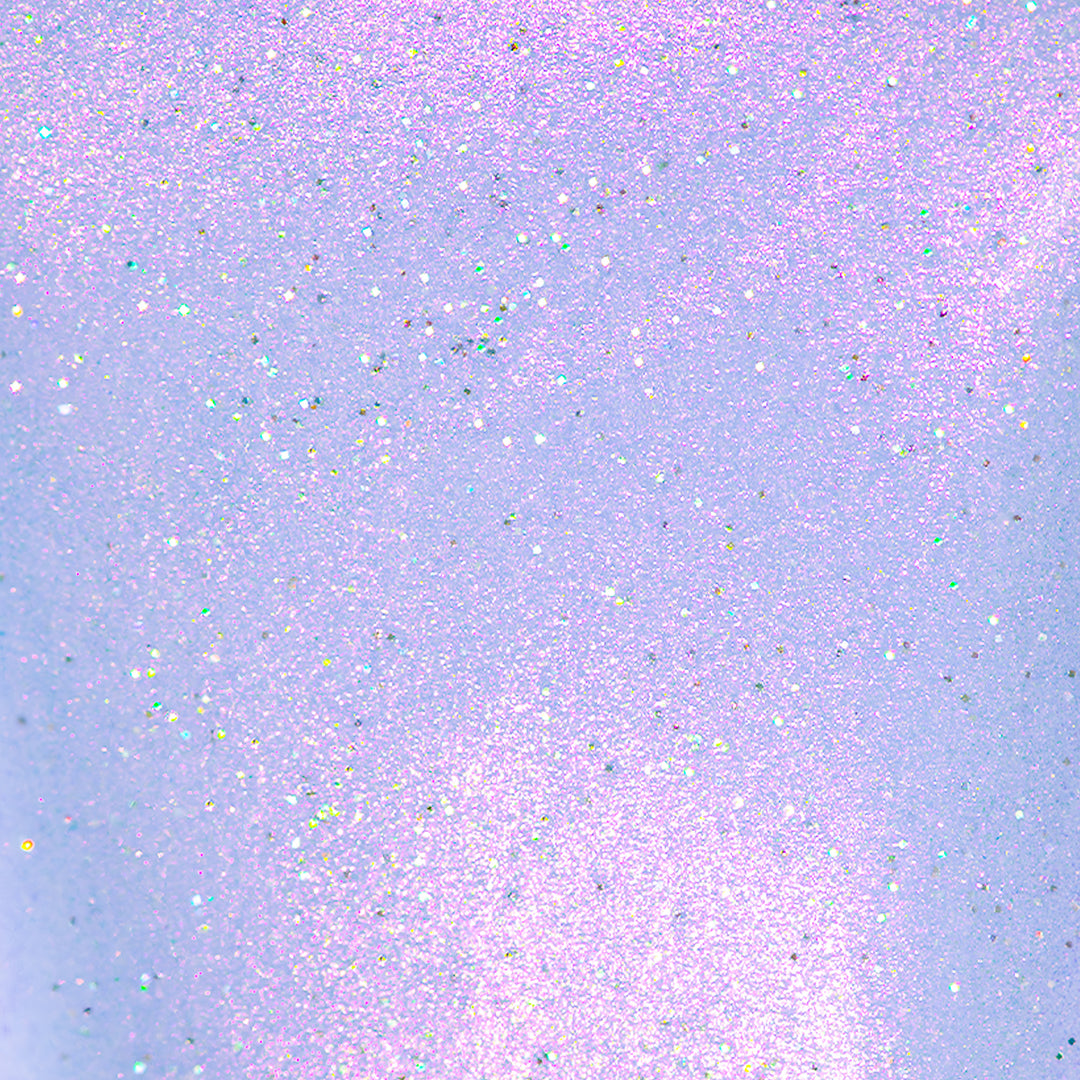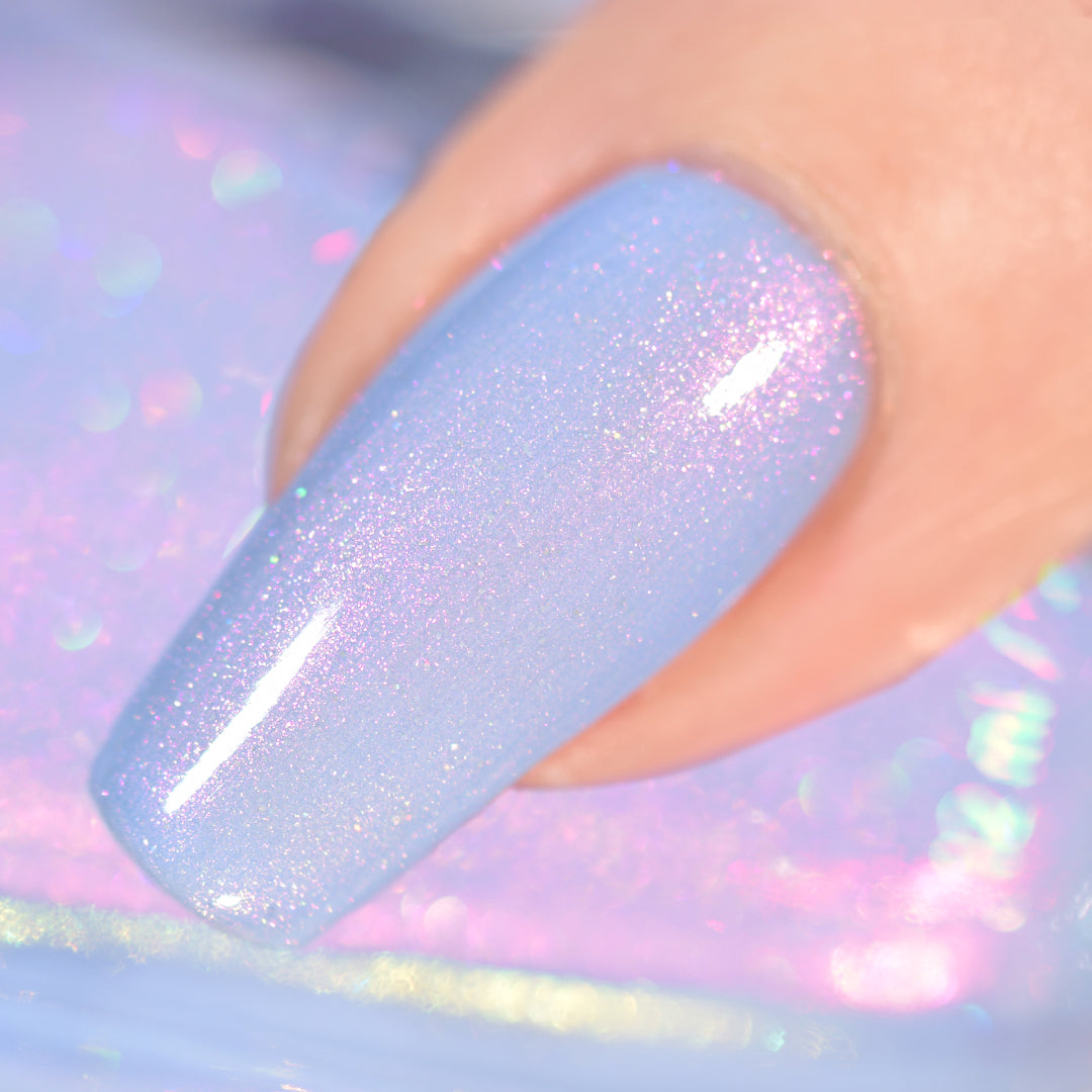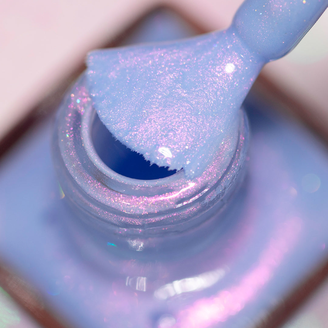 - Light cornflower blue jelly base with iridescent pink micro-shimmer and a dash of scattered holo
