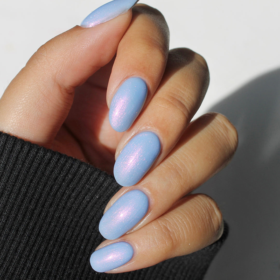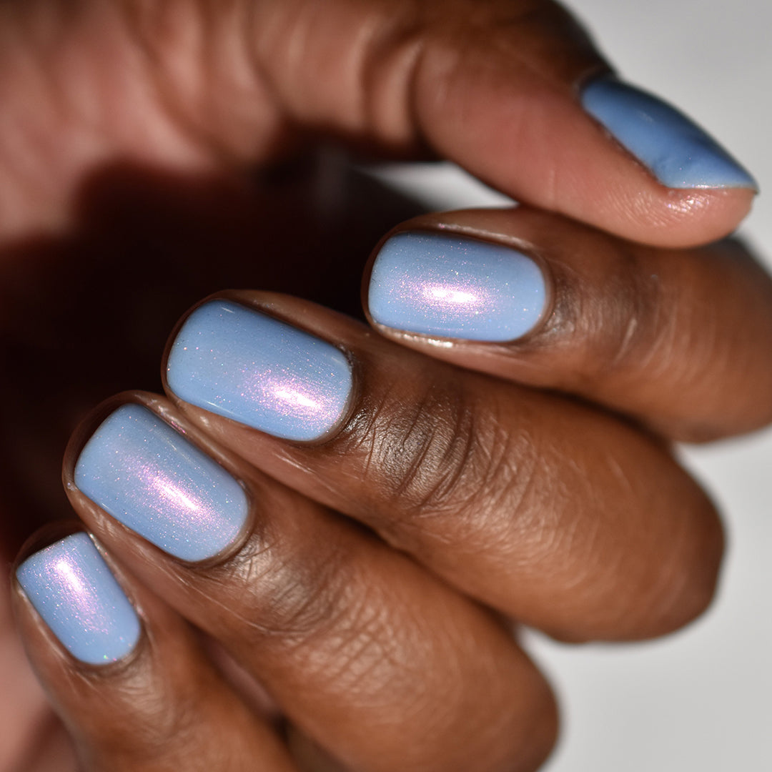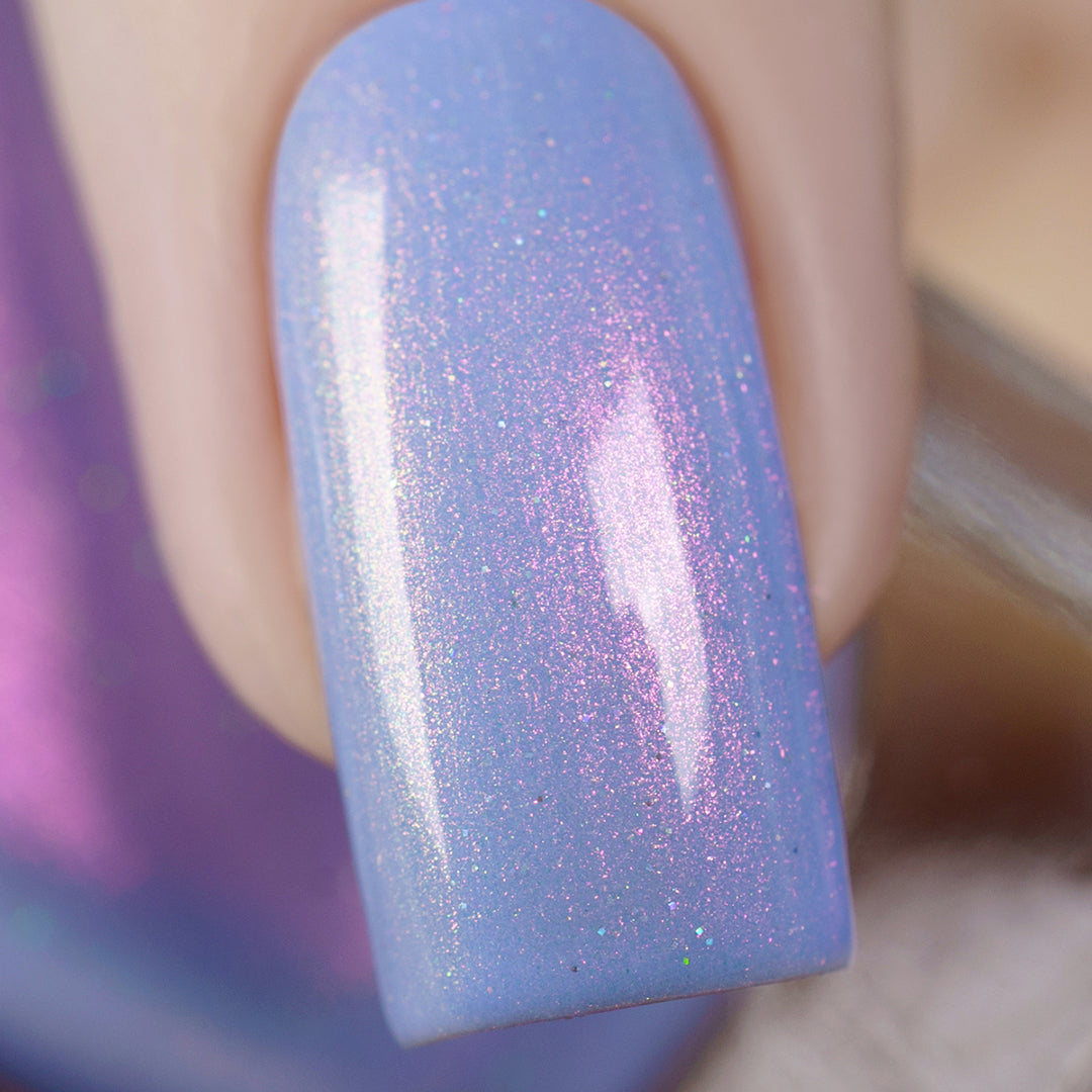 - Light cornflower blue jelly base with iridescent pink micro-shimmer and a dash of scattered holo