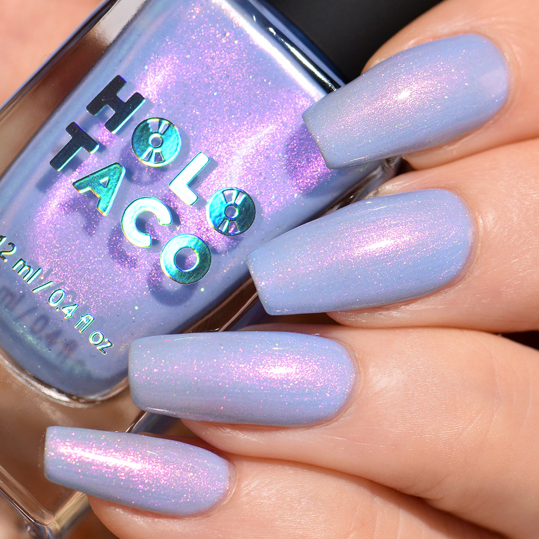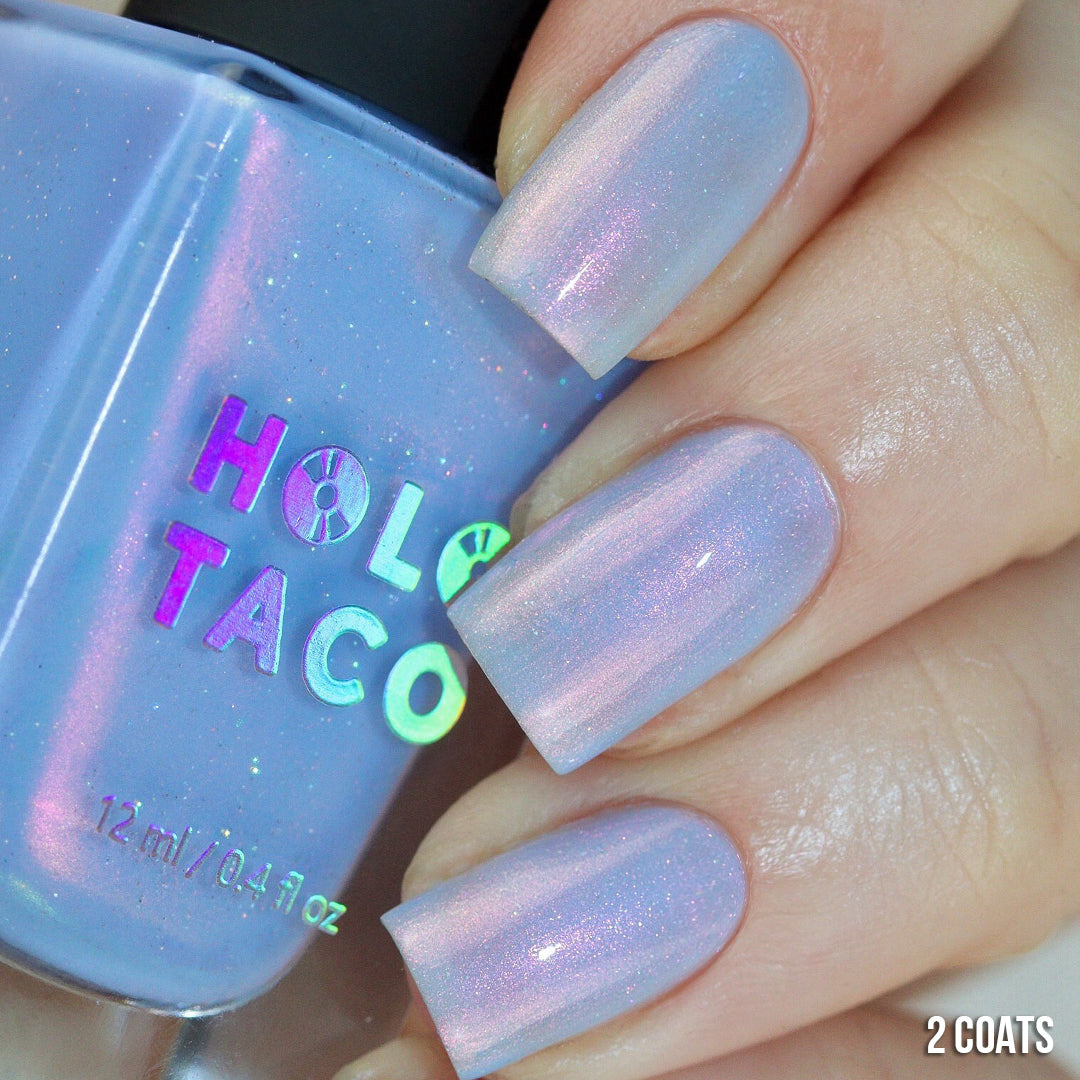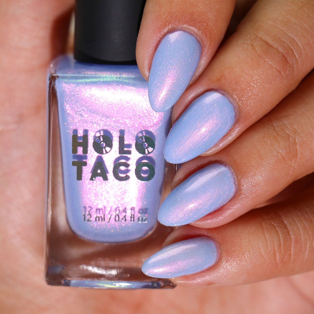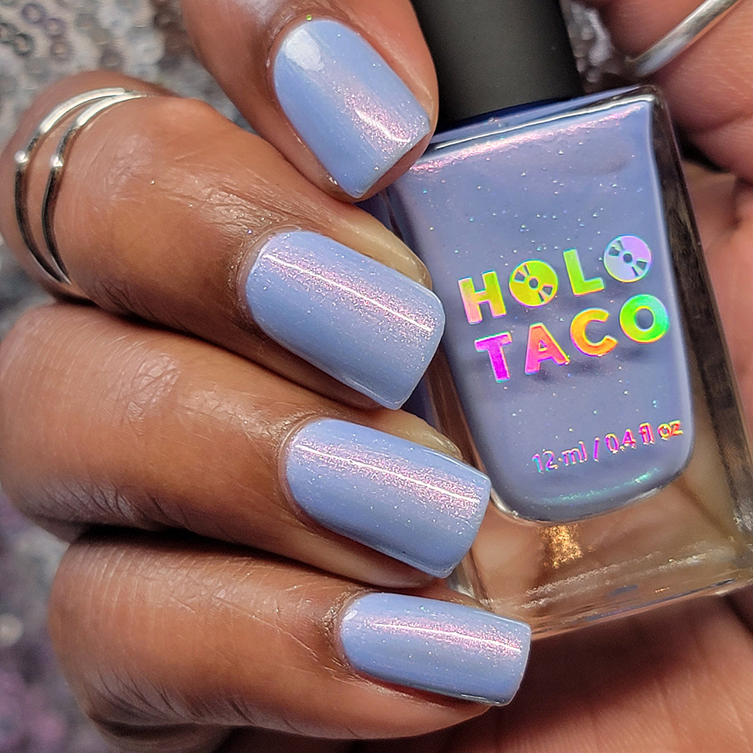 - Light cornflower blue jelly base with iridescent pink micro-shimmer and a dash of scattered holo